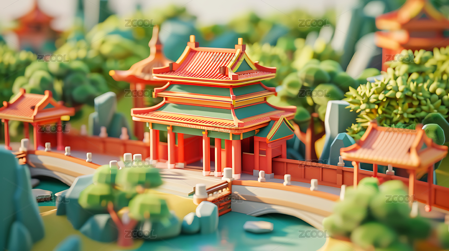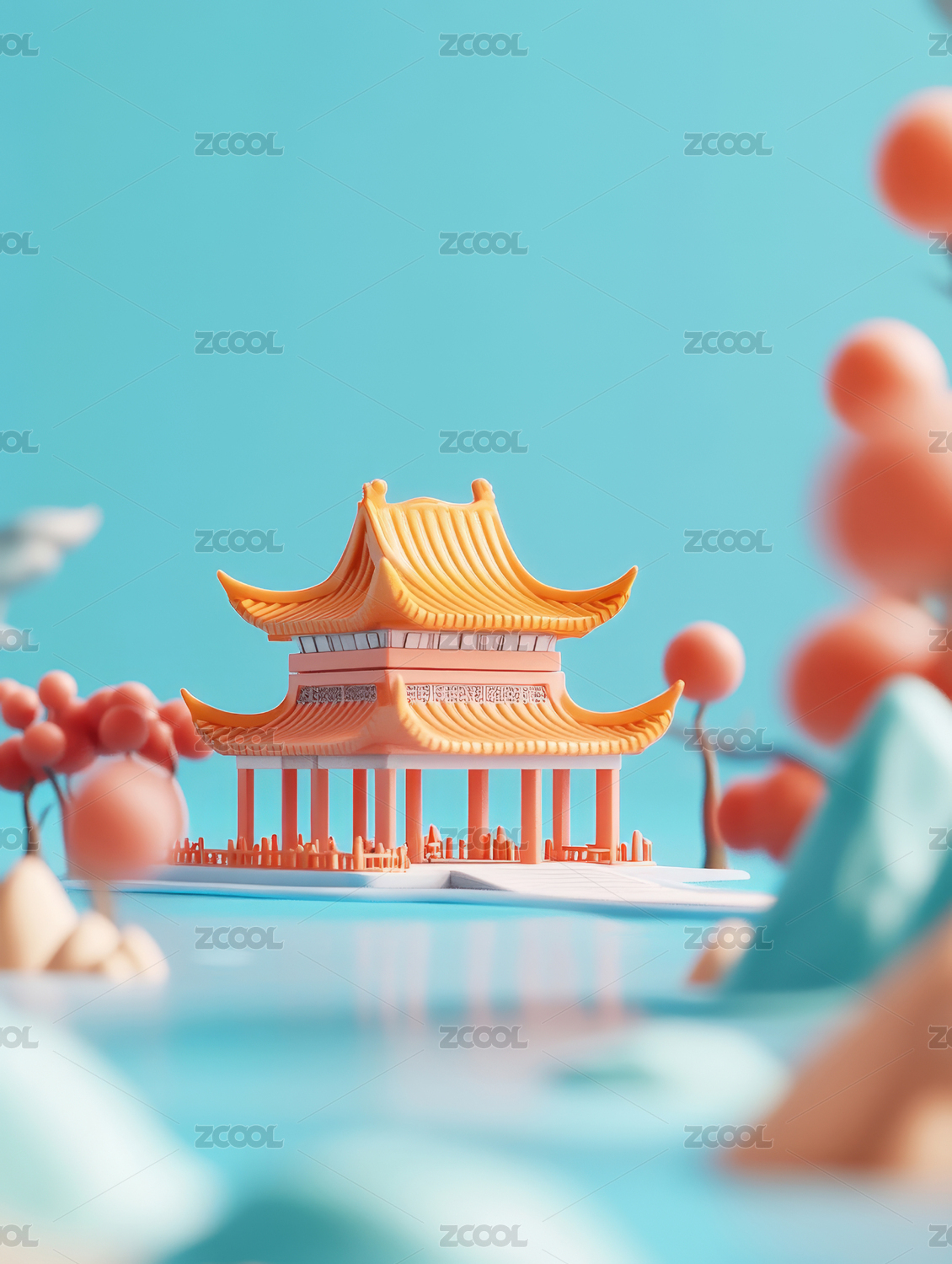 3D卡通国潮古建筑背景