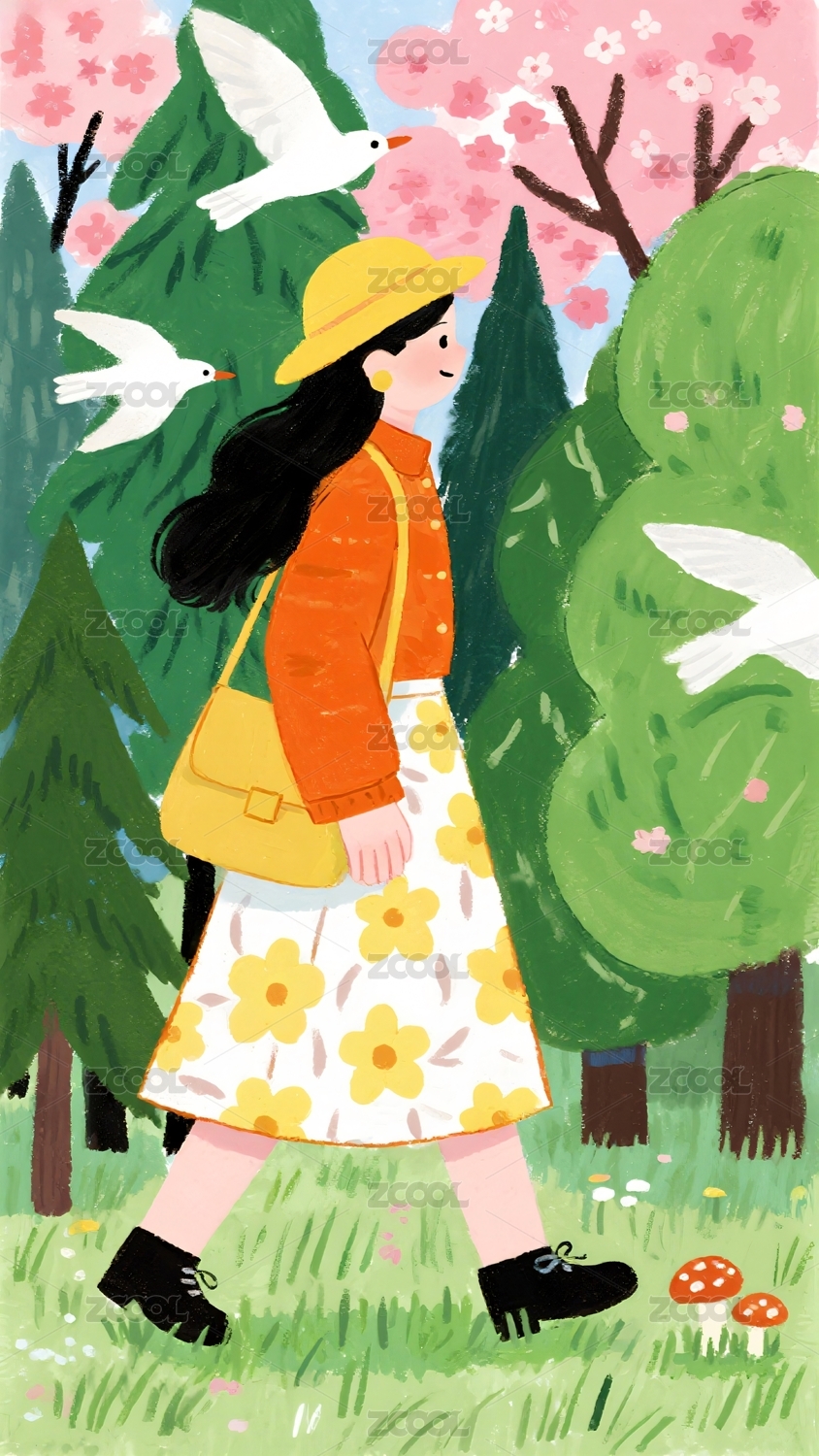 少女林中漫步赏景鸟儿飞舞
