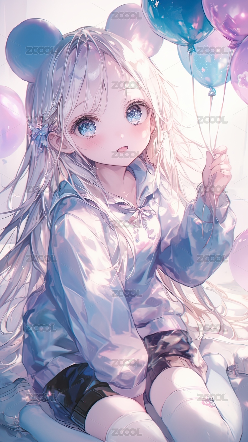 粉色少女怀抱熊猫玩偶背景飘满气球