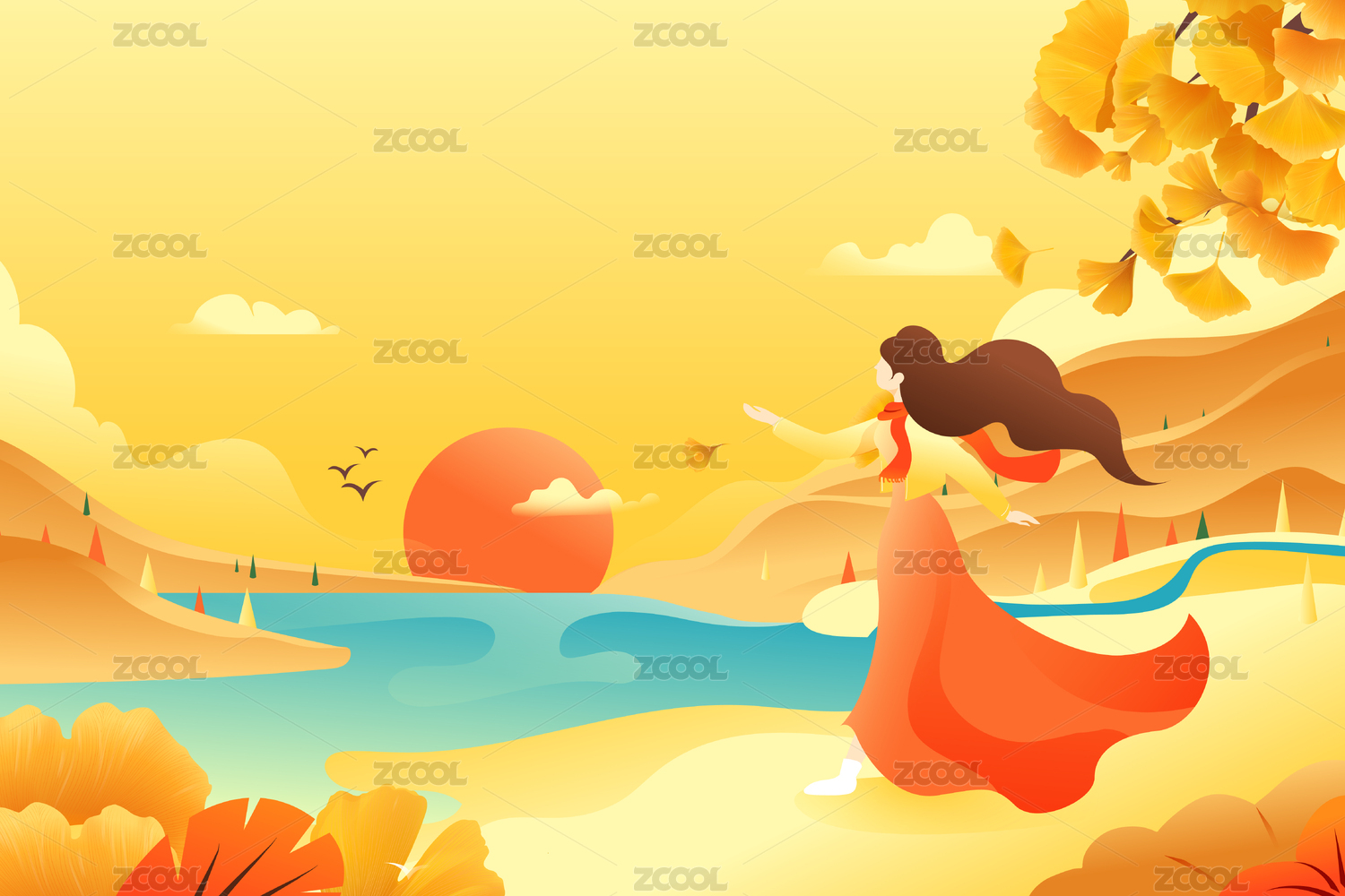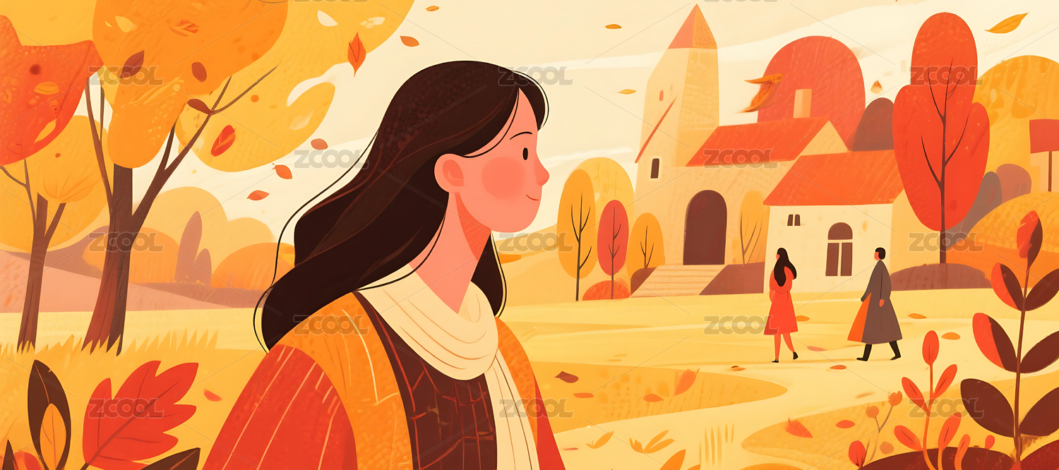 立秋节气金秋时节银杏落叶秋分人物出行插画