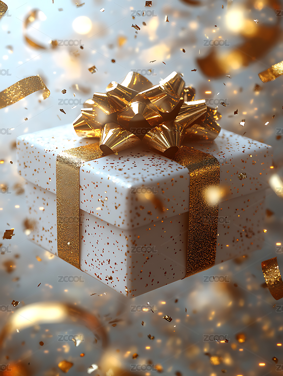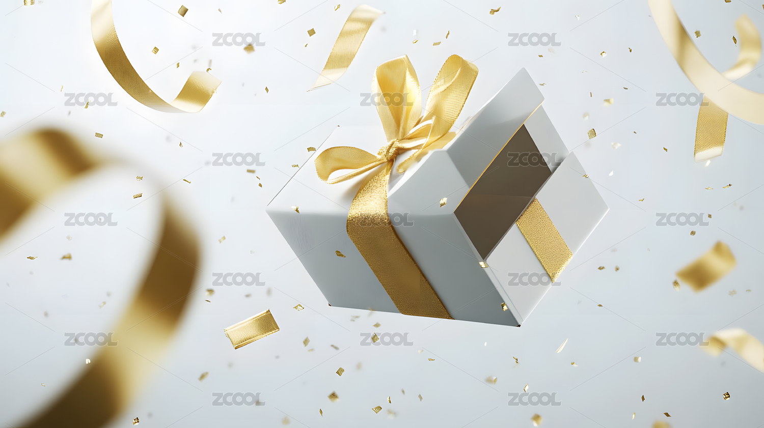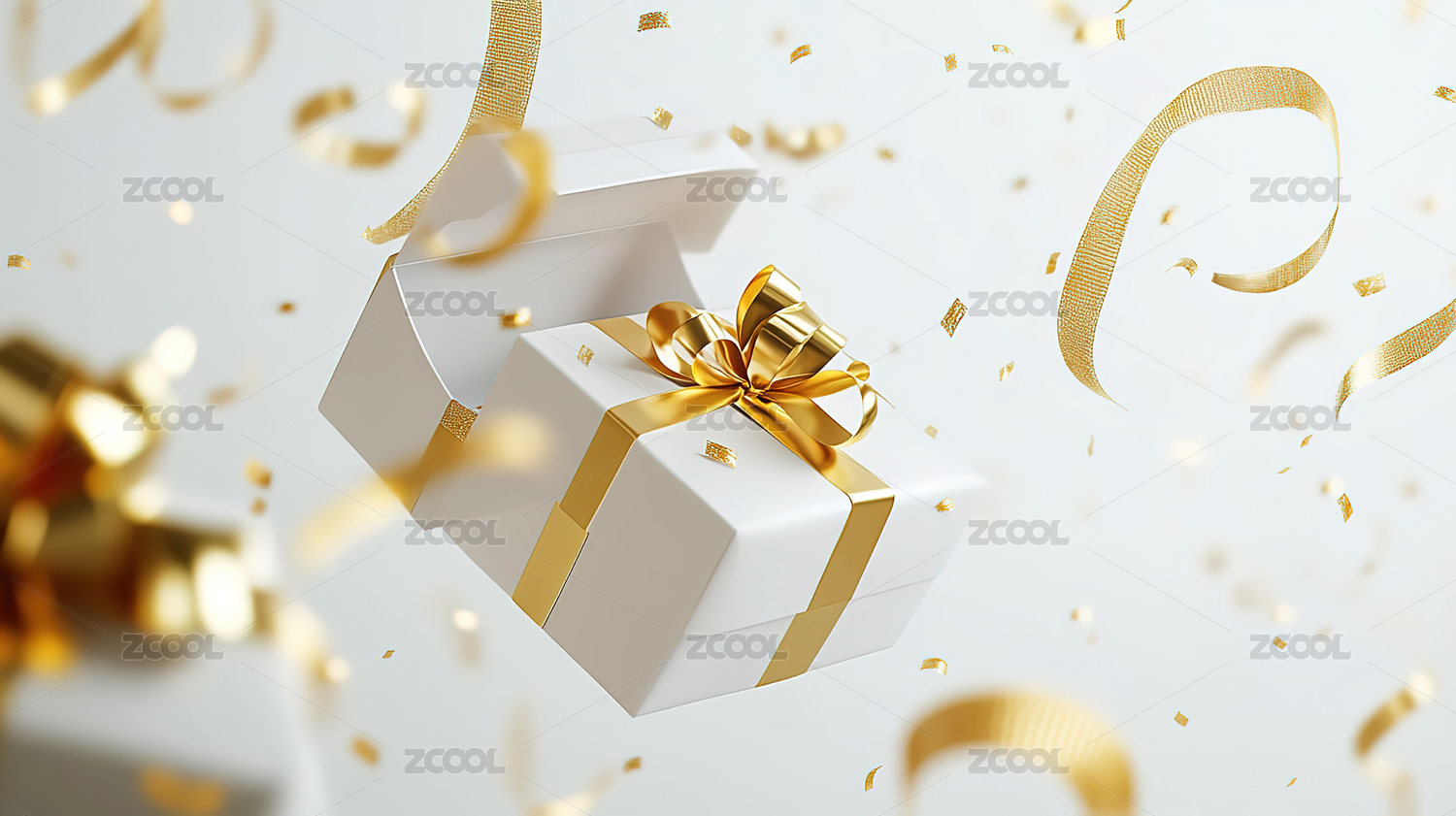 白色礼盒金色丝带飘浮,金色纸片散落庆祝