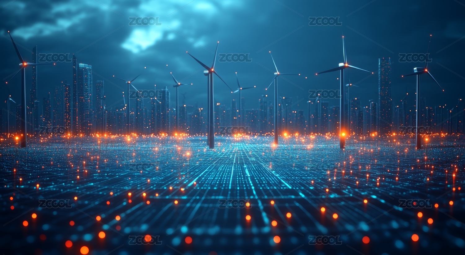 未来城市夜景中风力发电机与高楼交相辉映