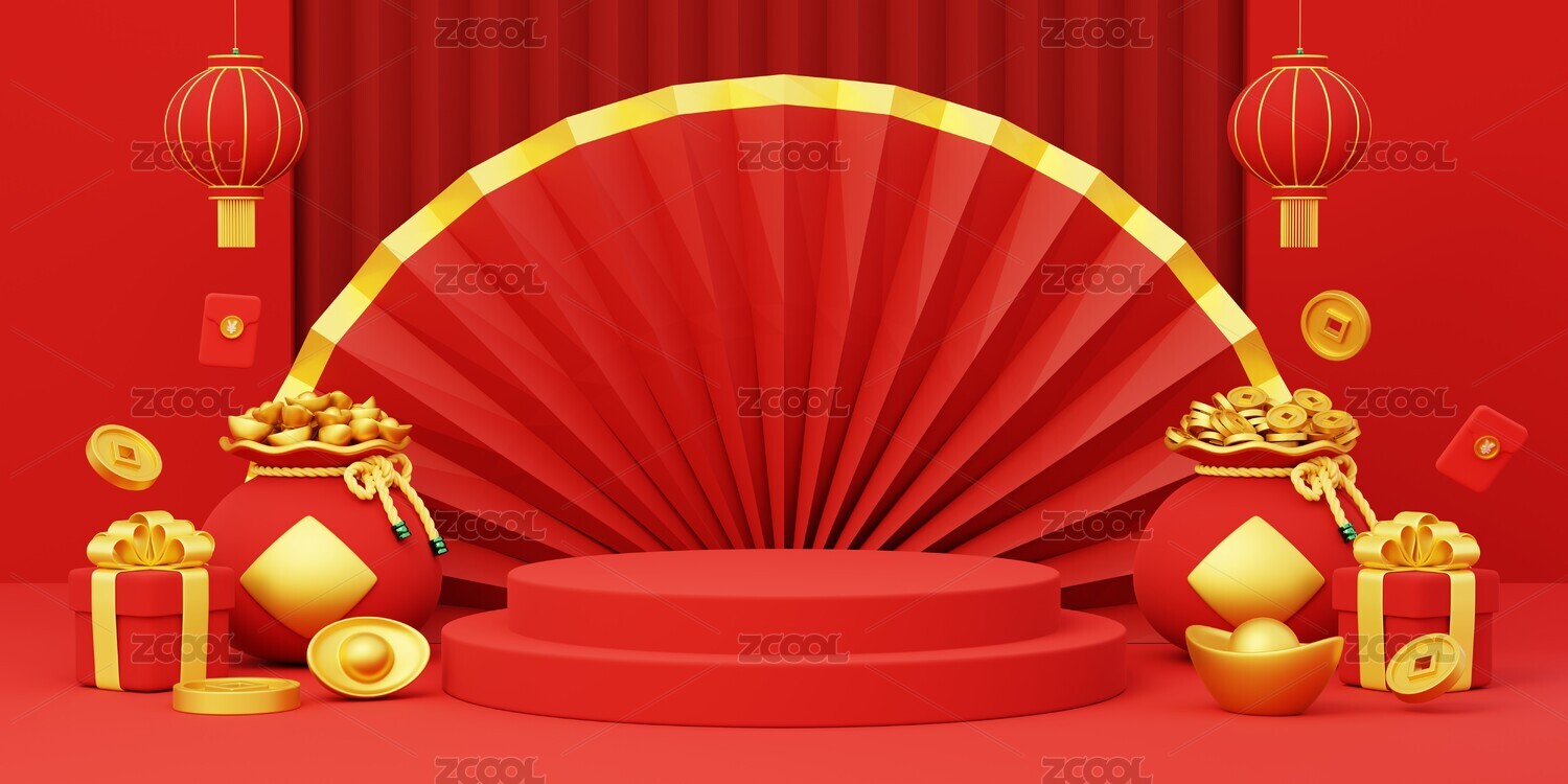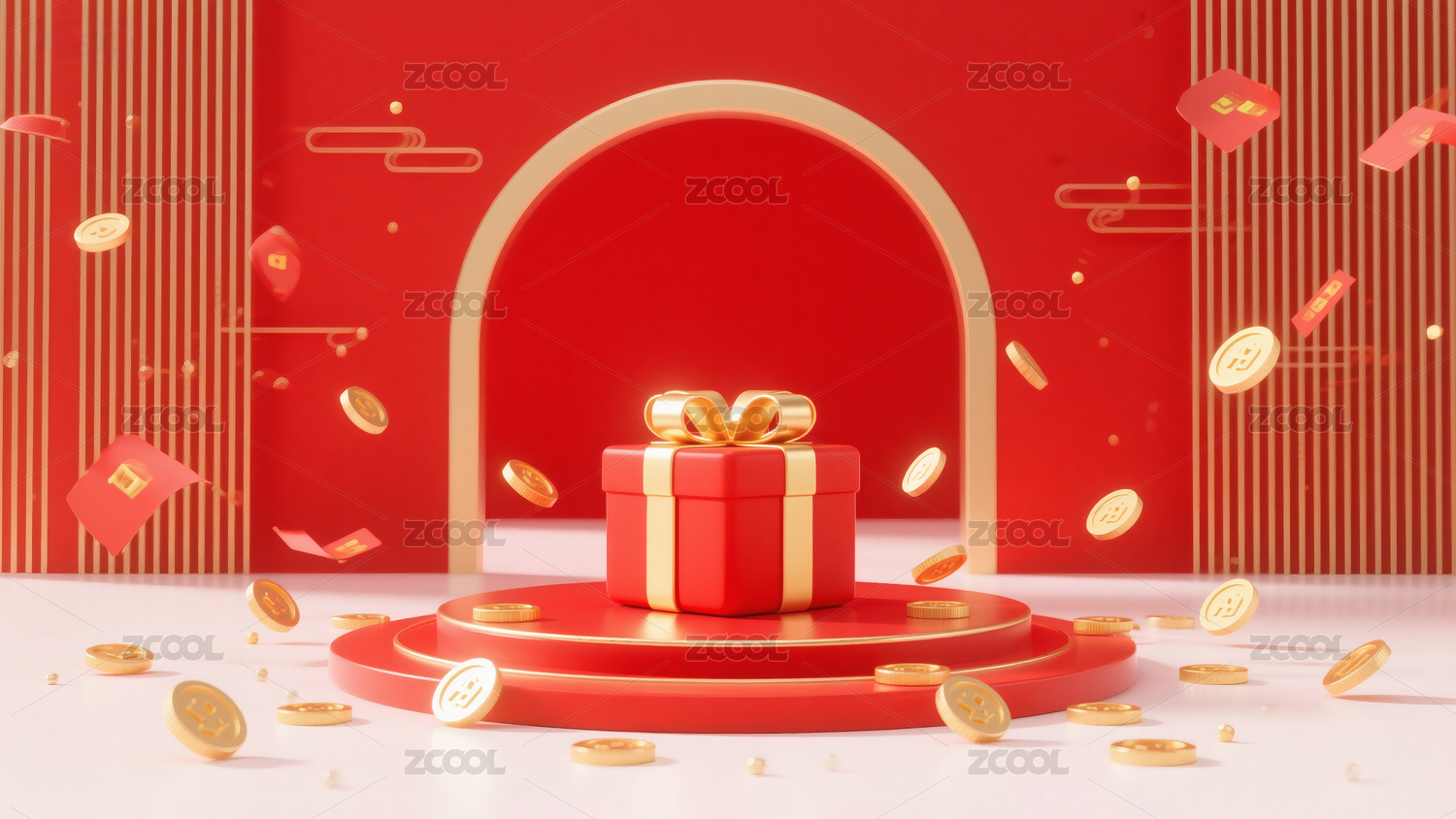 电商三维舞台场景金币喷出红色礼盒产品展台