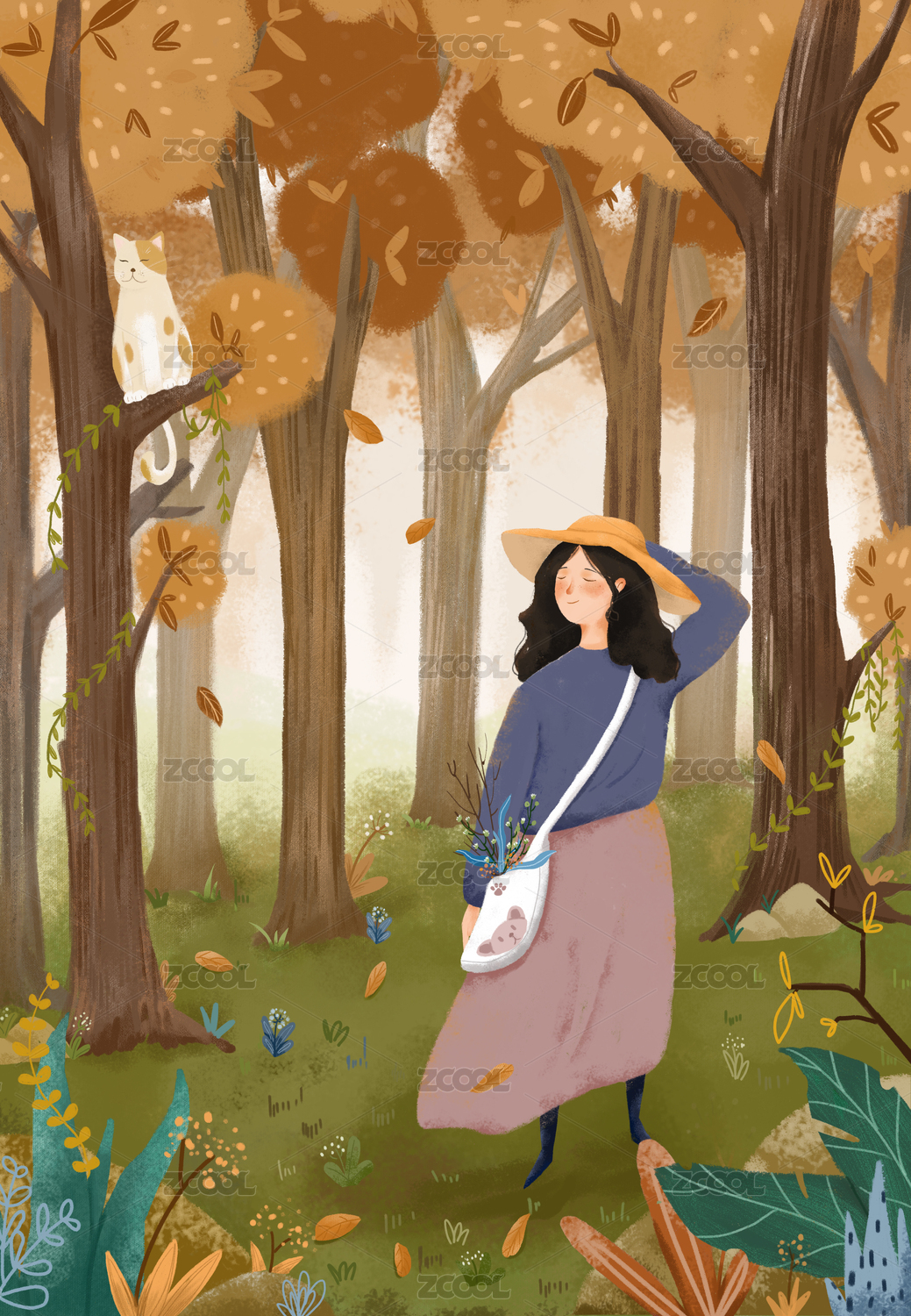 手绘肌理插画秋天远山树木草地靠着树的女孩