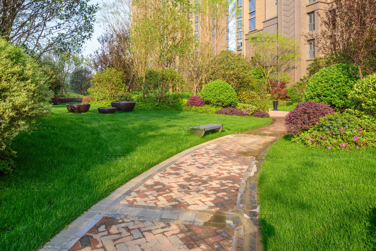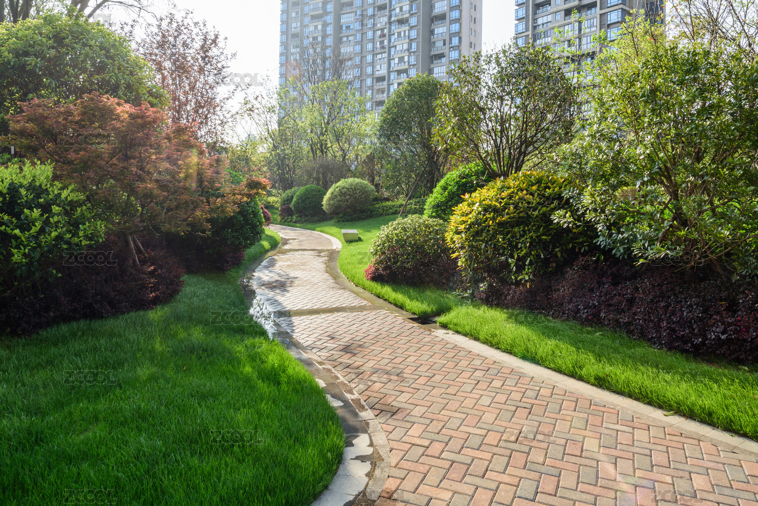 小区住宅里弯曲的步行道,砖路边绿色草坪,园林景观设计