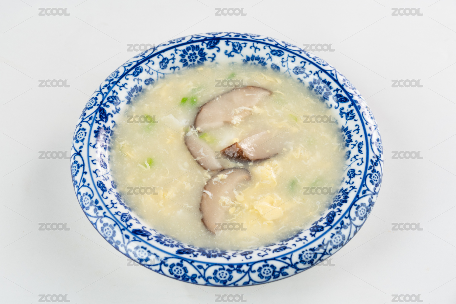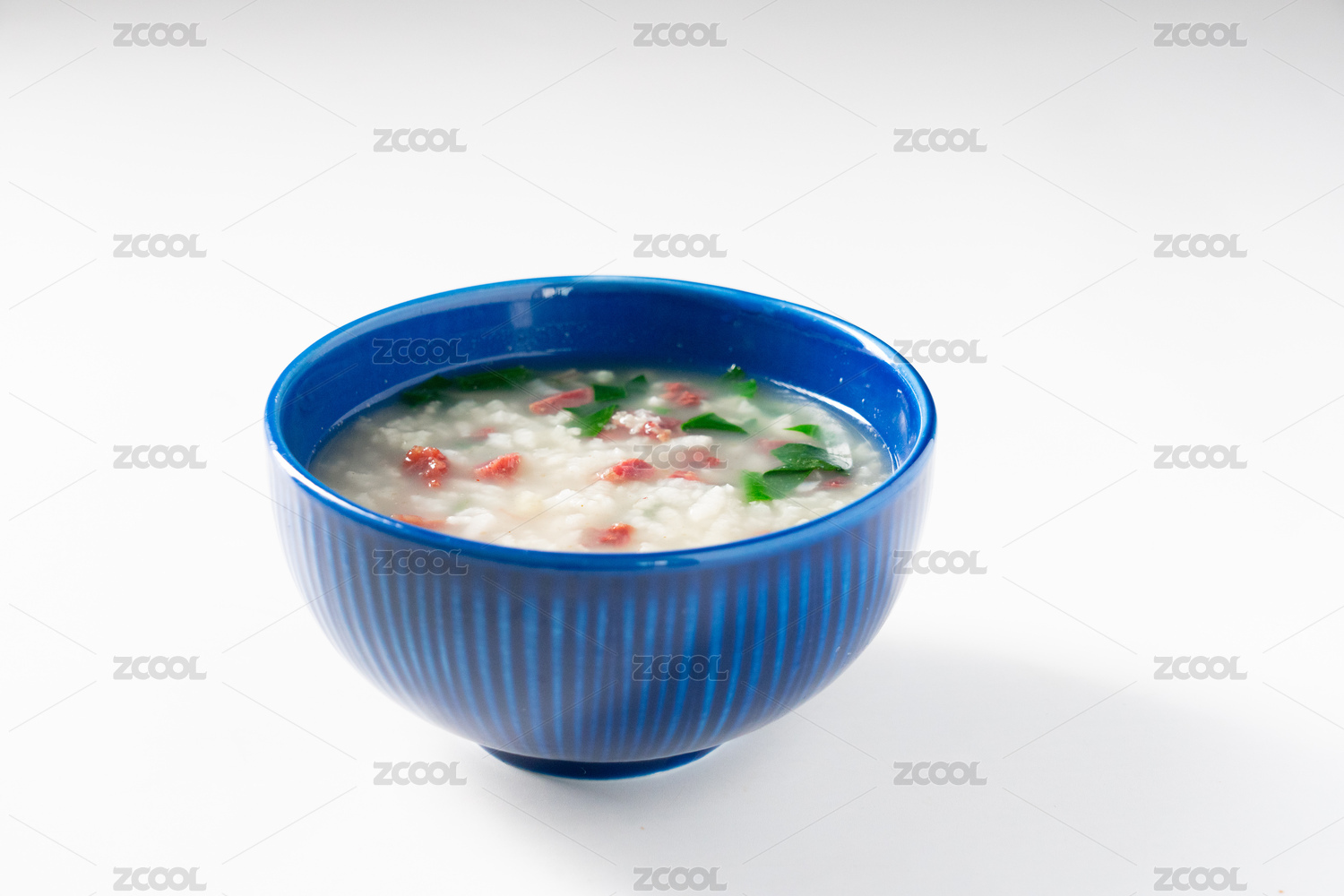 白色背景中青色小碗里盛放着的皮蛋粥