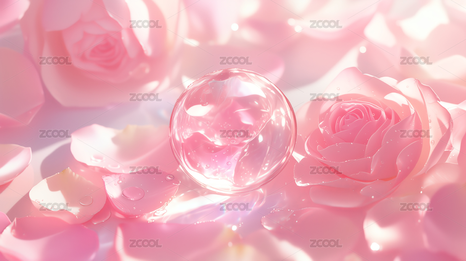 晶莹剔透的粉色玫瑰与钻石