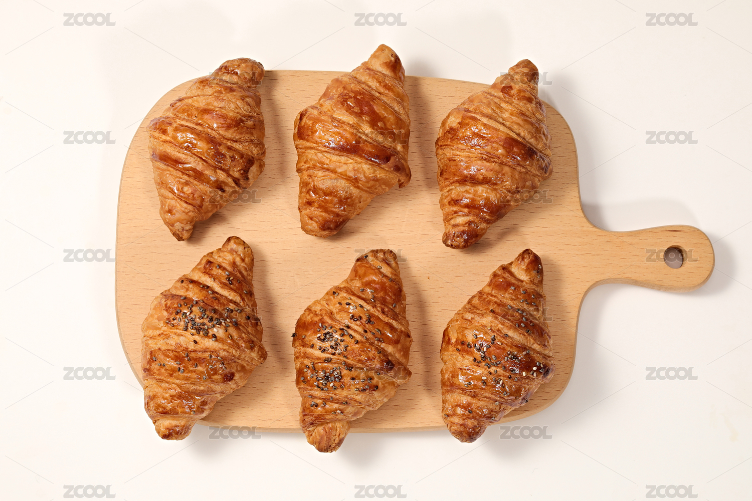 放在木砧板上一个和半个可颂面包