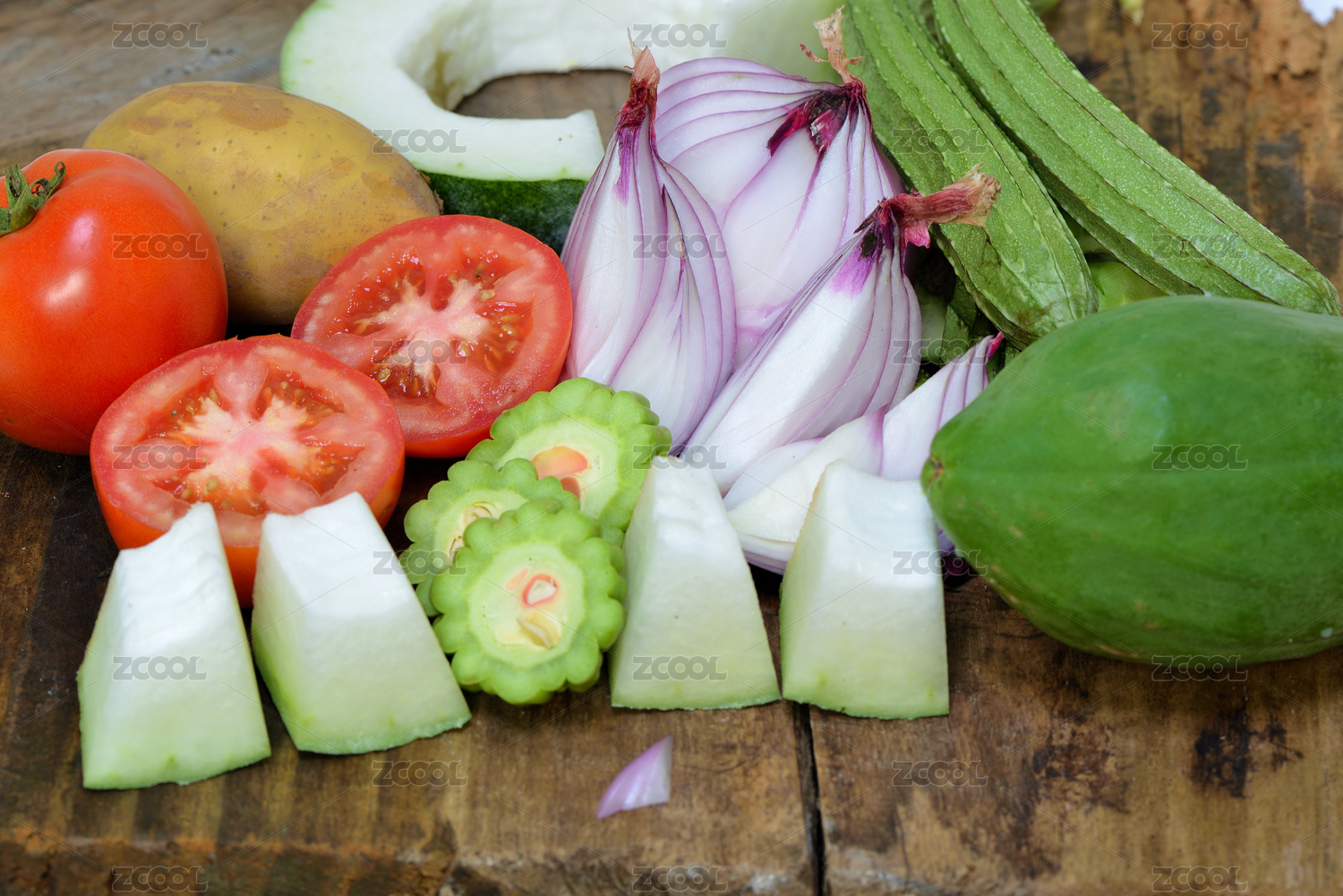 切开的新鲜的瓜果蔬菜在木板上面摆放着
