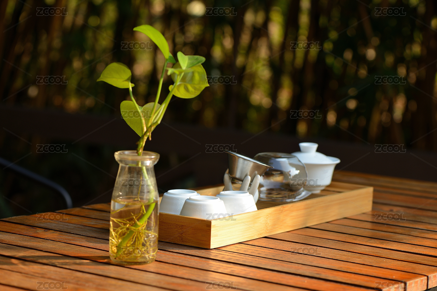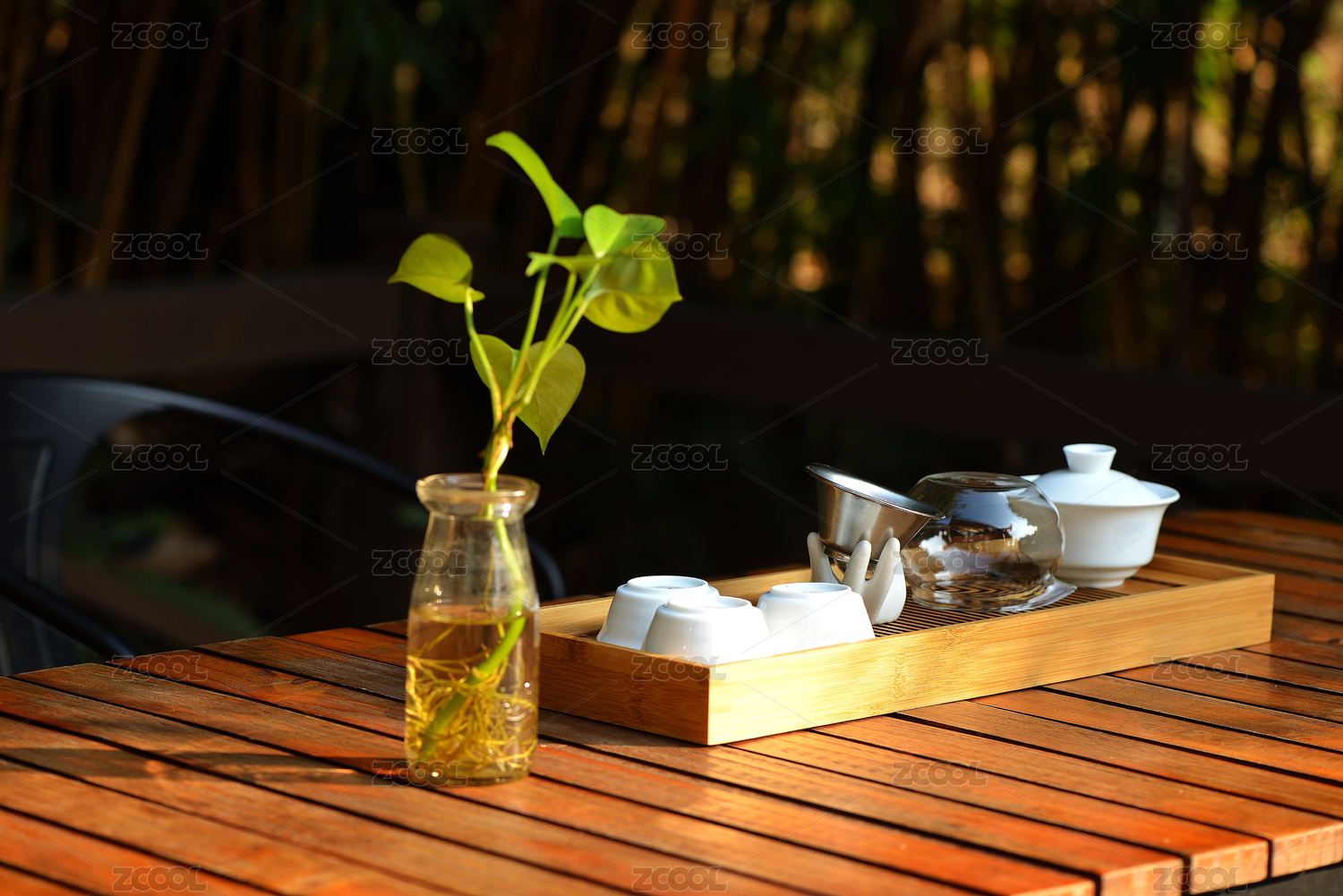 阳光下的茶具与绿植
