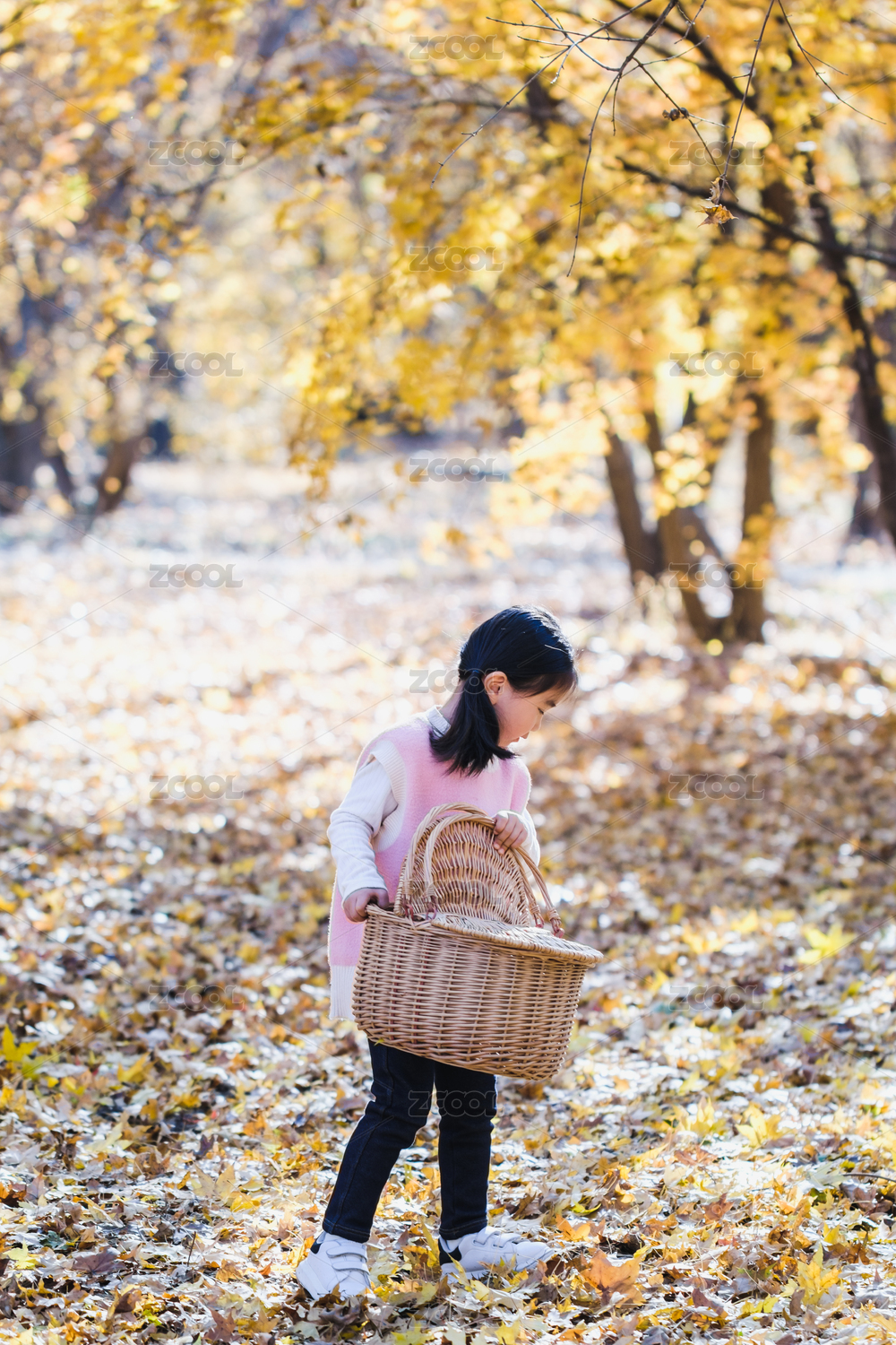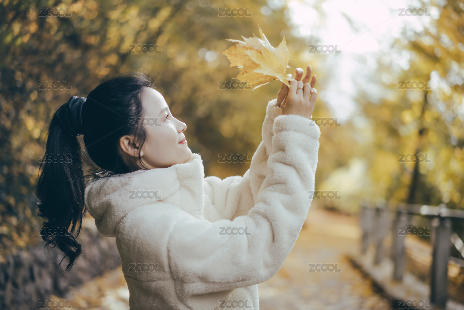 手持落叶的女孩,站在秋天落叶的森林小径上