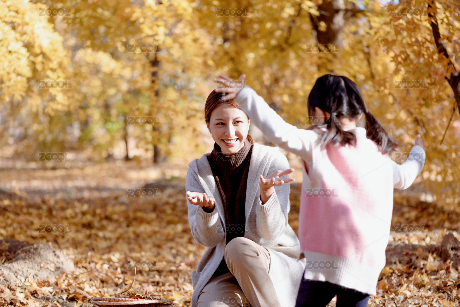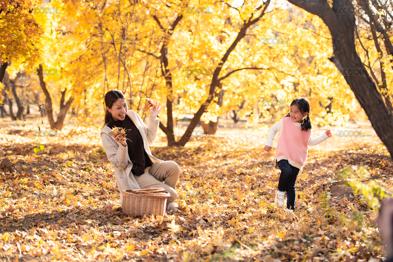 年轻的妈妈和女儿在秋天的公园里快乐的玩耍