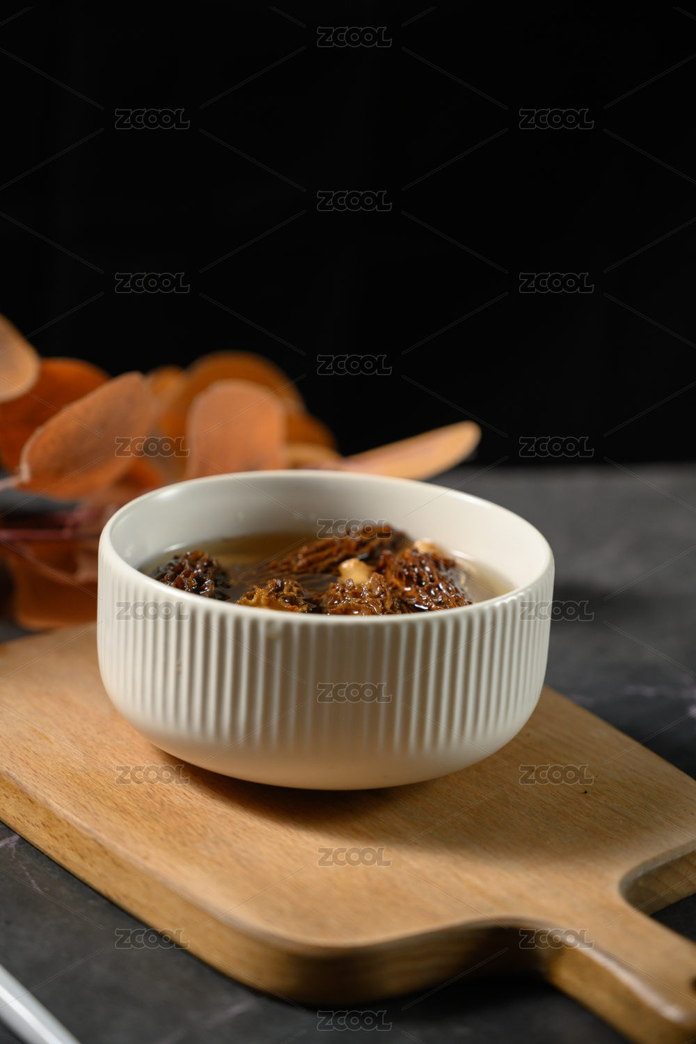 桌面上的碗里泡发开的羊肚菌
