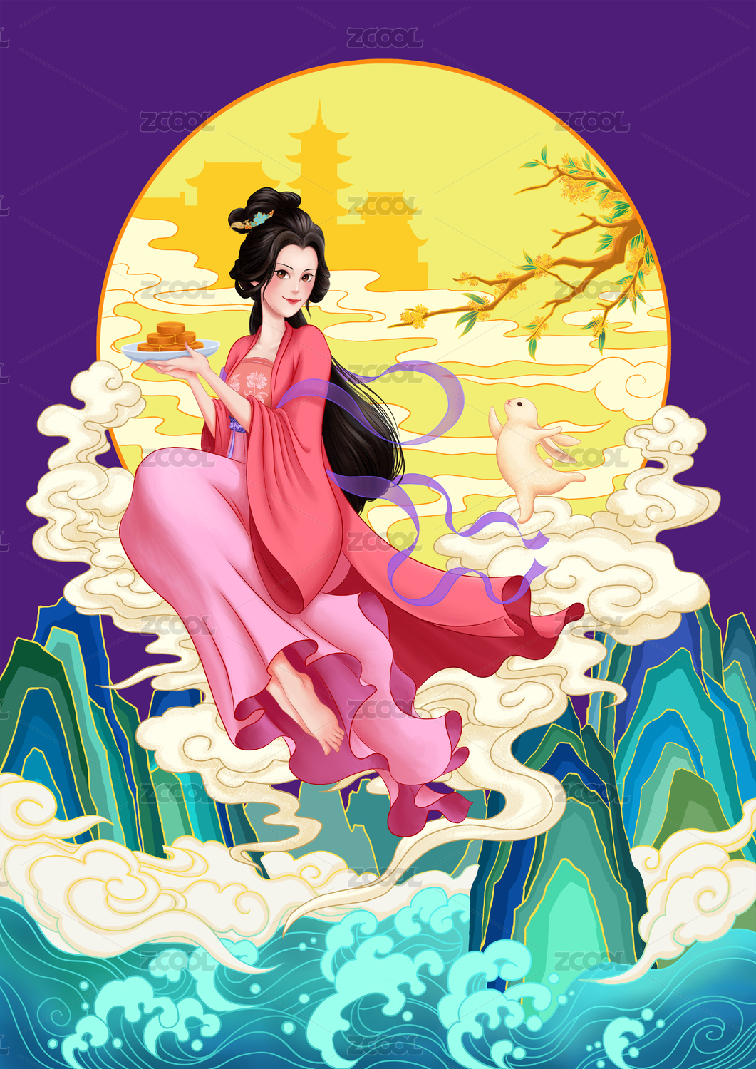 月亮古风桂花美女兔子新中式插画