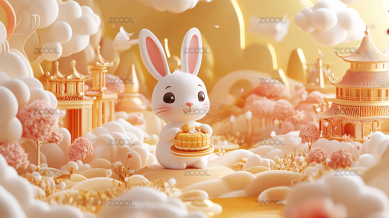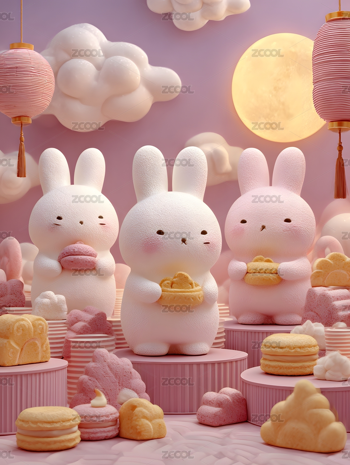中秋节,插画,兔子,月饼,可爱风,AI数字艺术,中国文化,节日,传统节日,三维图形