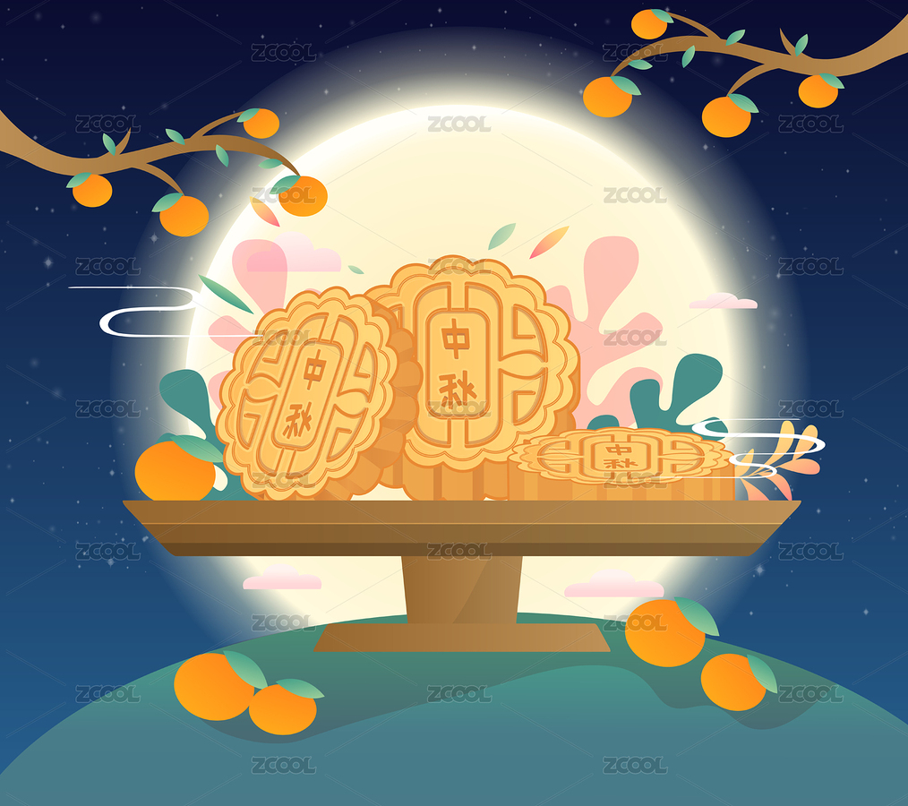 国潮风花好月圆中秋节满月桂花月饼矢量插画