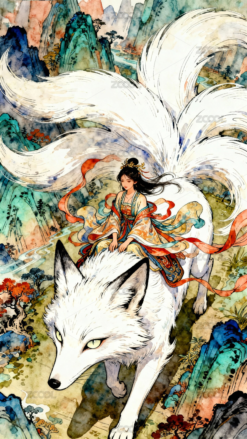 动物,可爱的,插画,水彩,水墨,中国画,白狐,九尾狐,狐狸