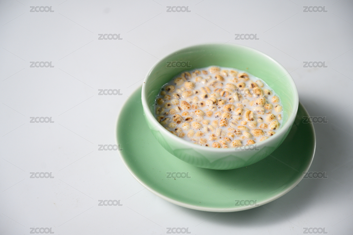 桌面上的碗里的美味可口的牛奶薏米花