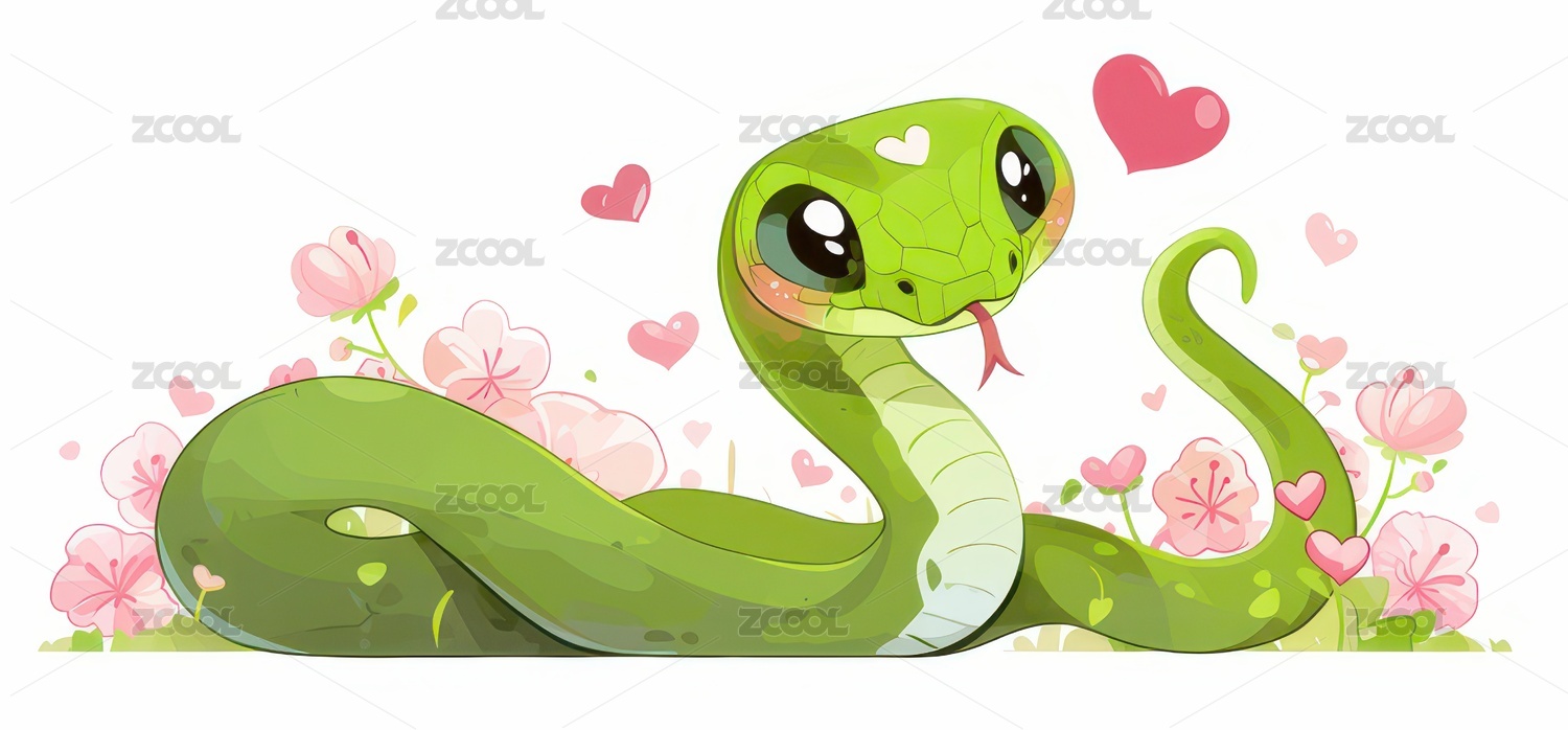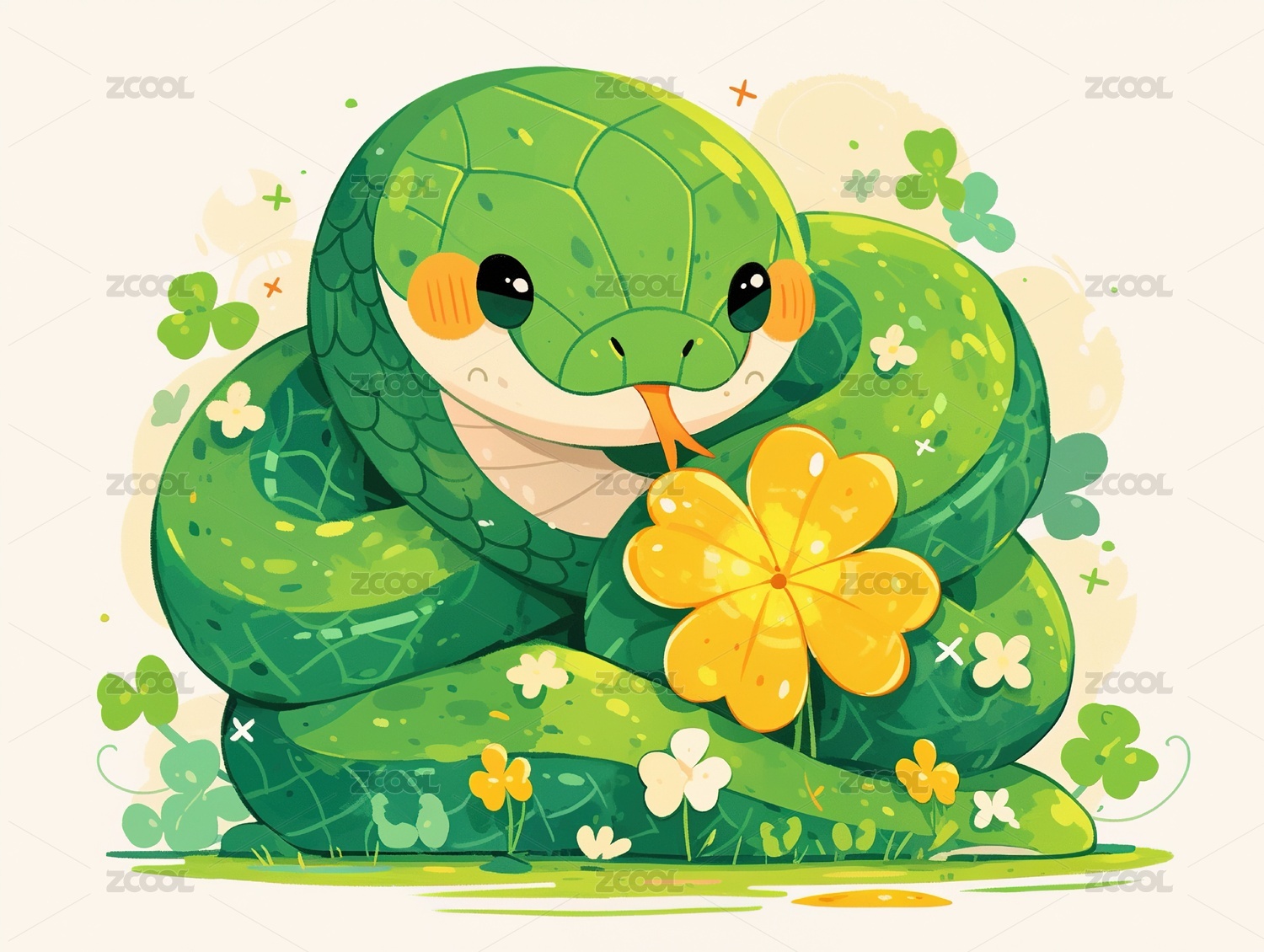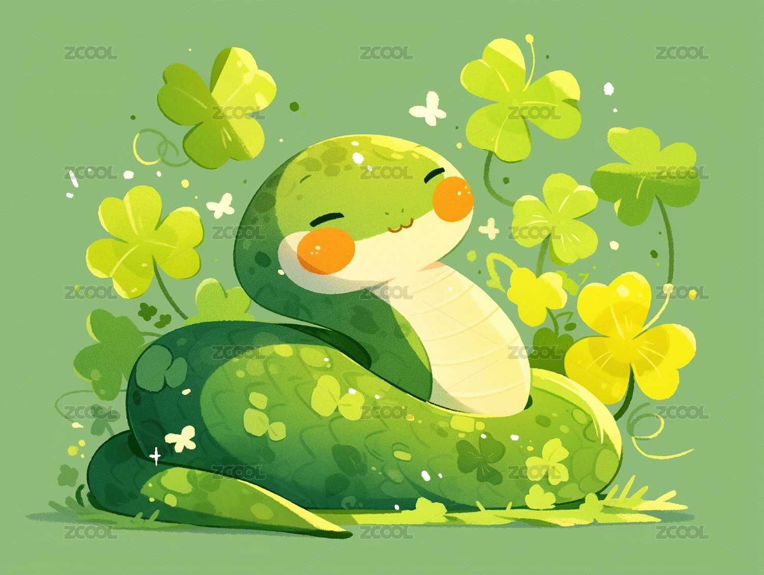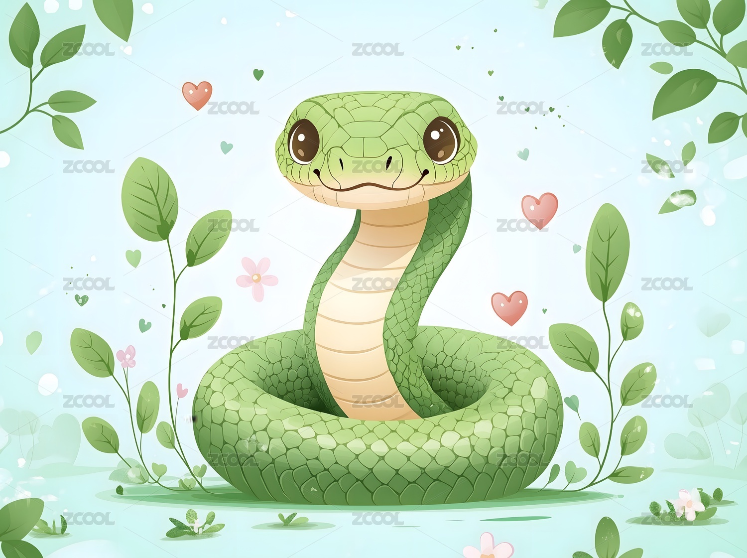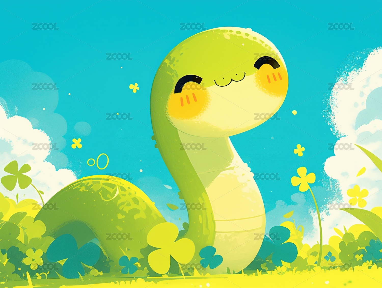 手绘卡通草丛中可爱的绿色生肖蛇插画