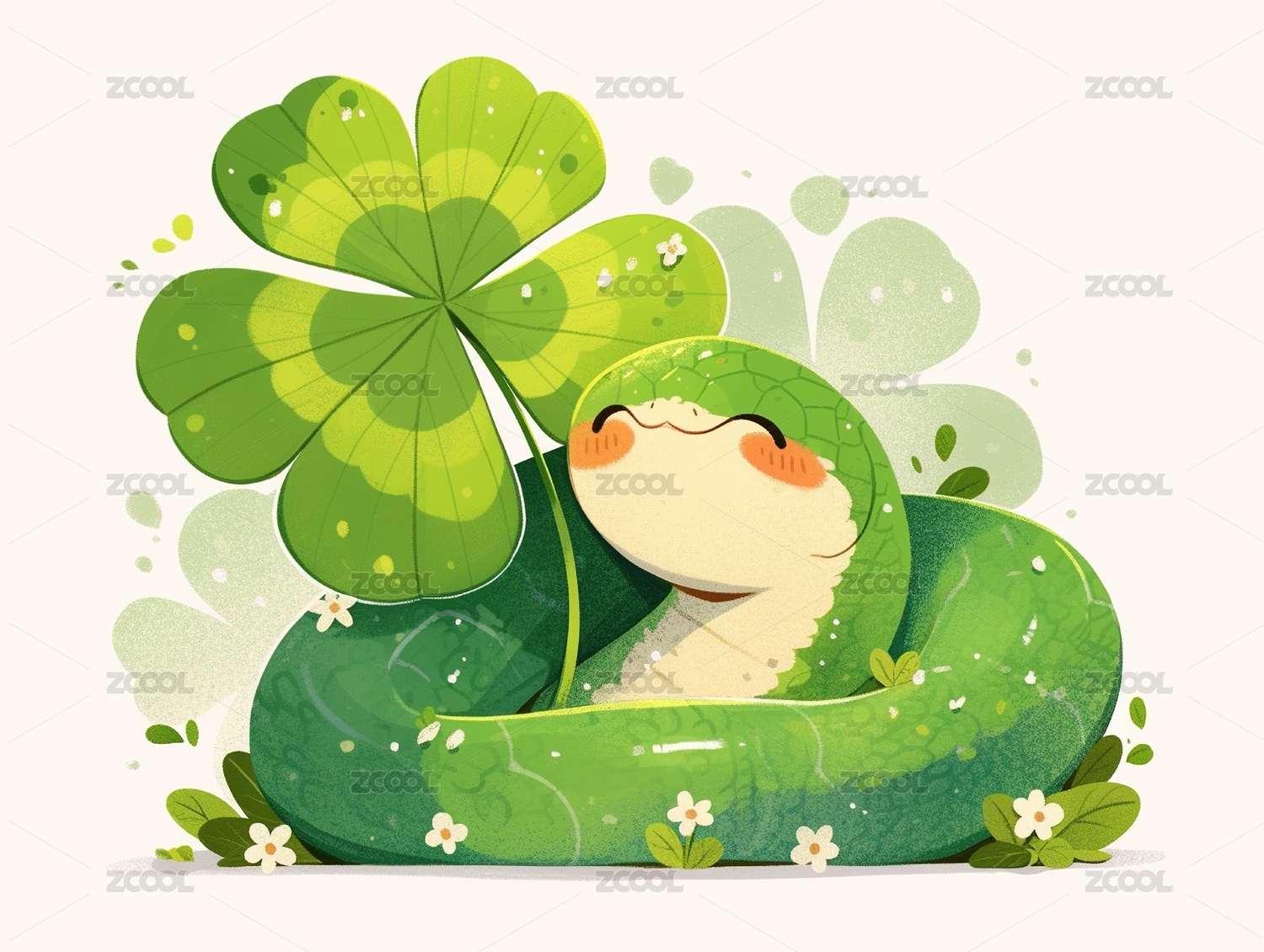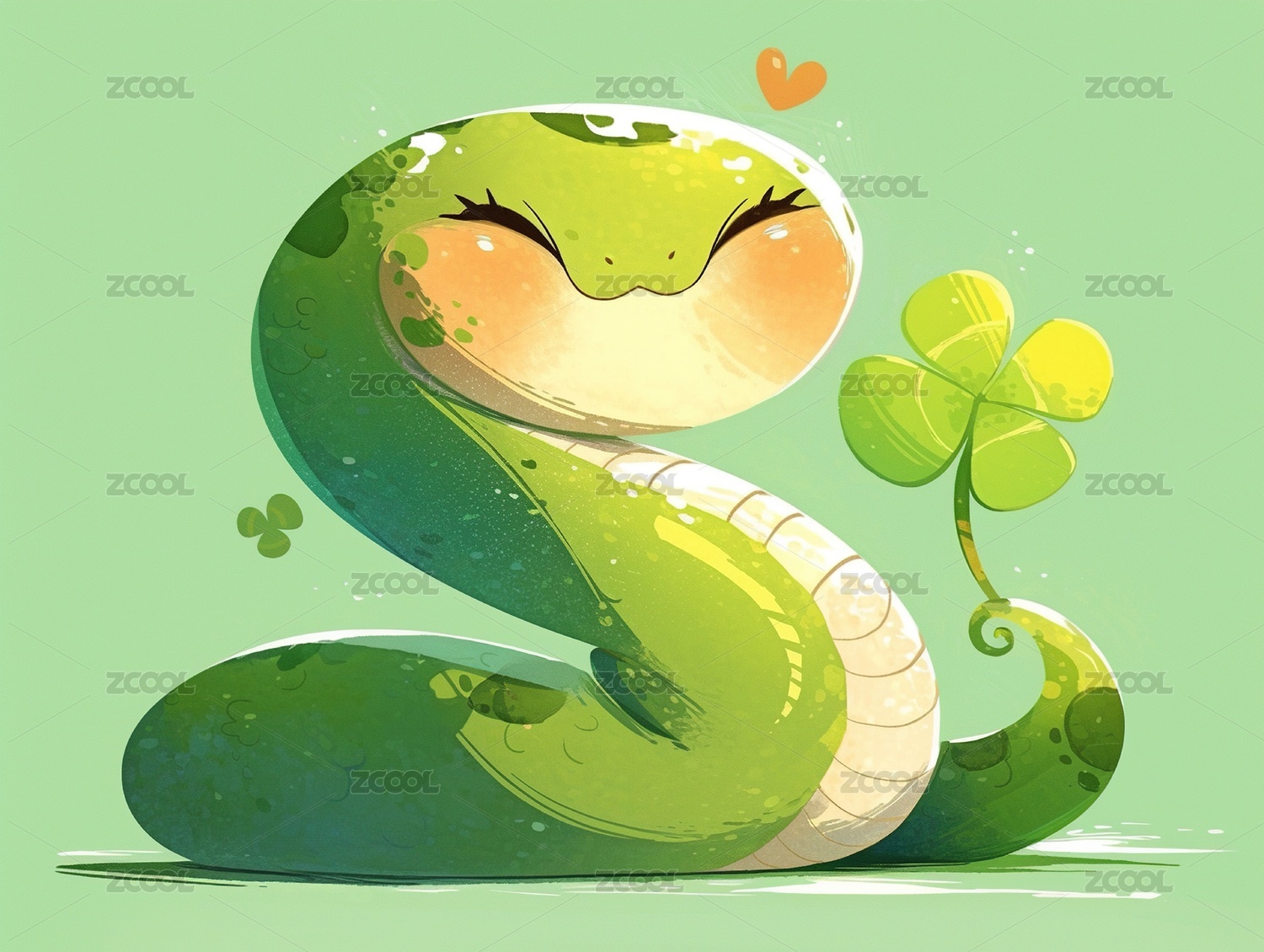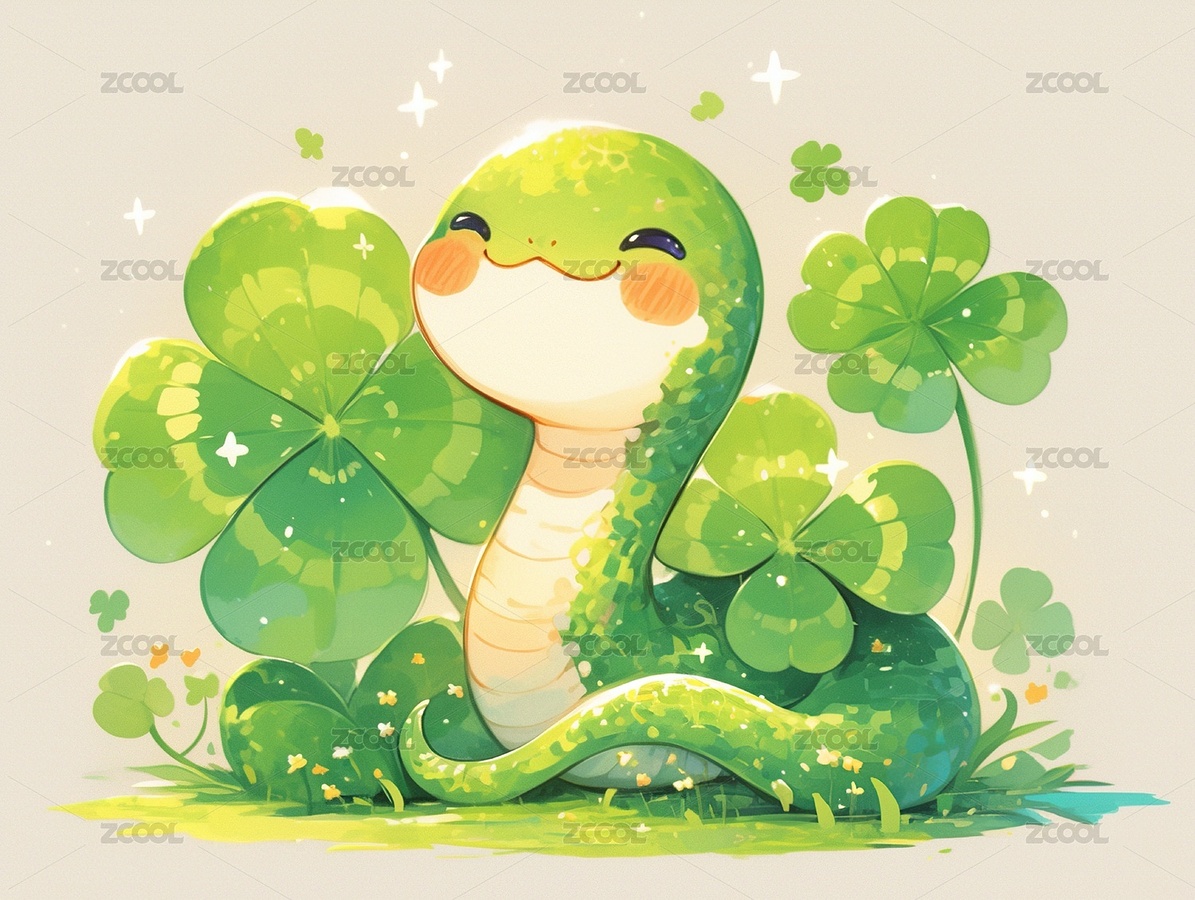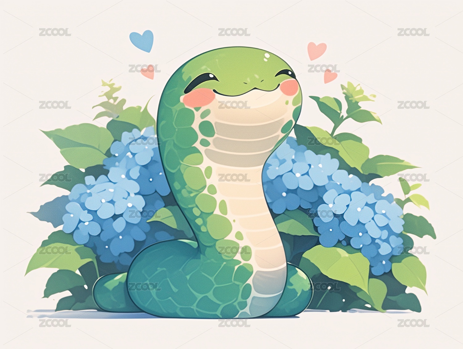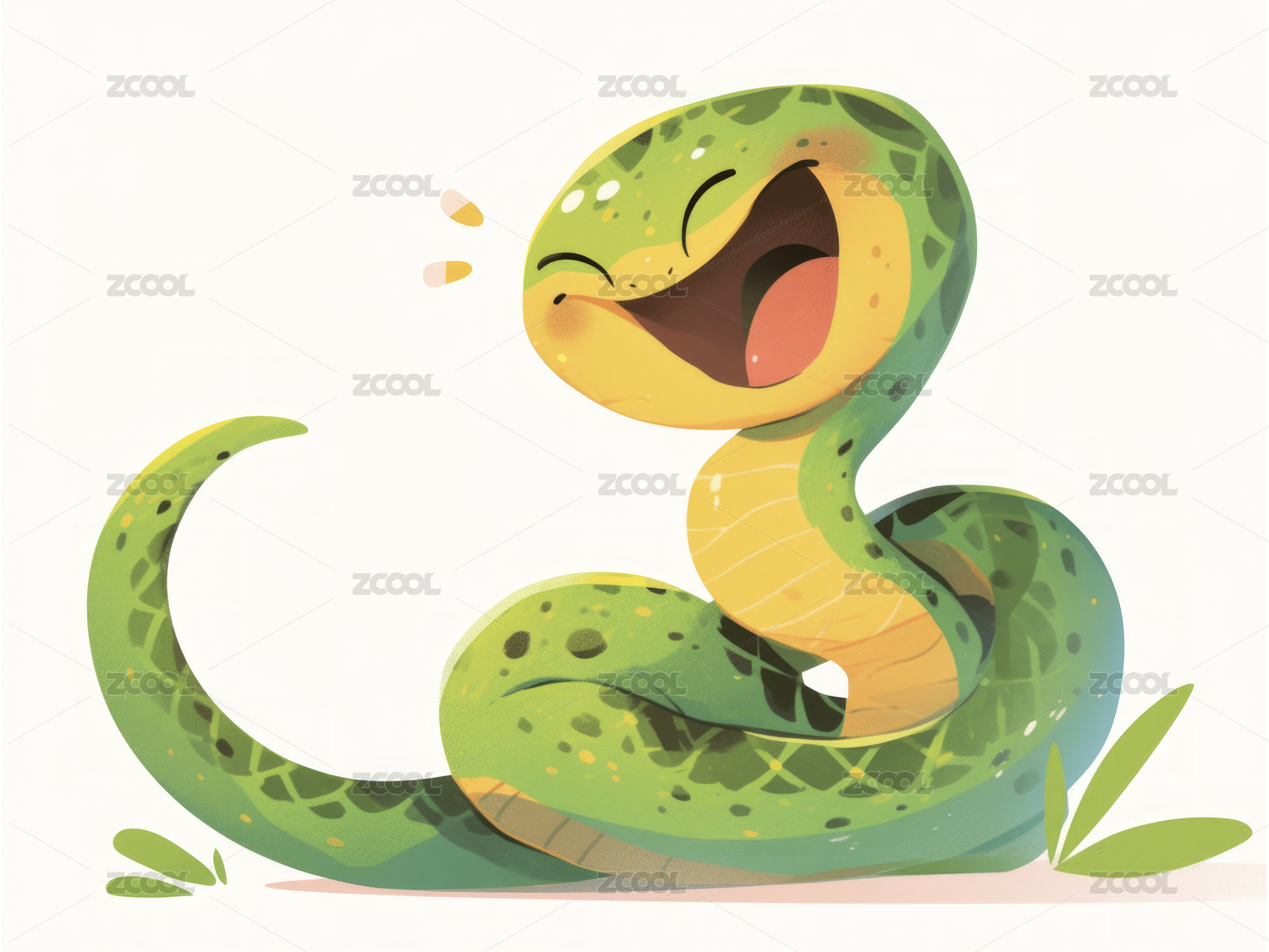 手绘卡通草丛中可爱的绿色生肖蛇插画