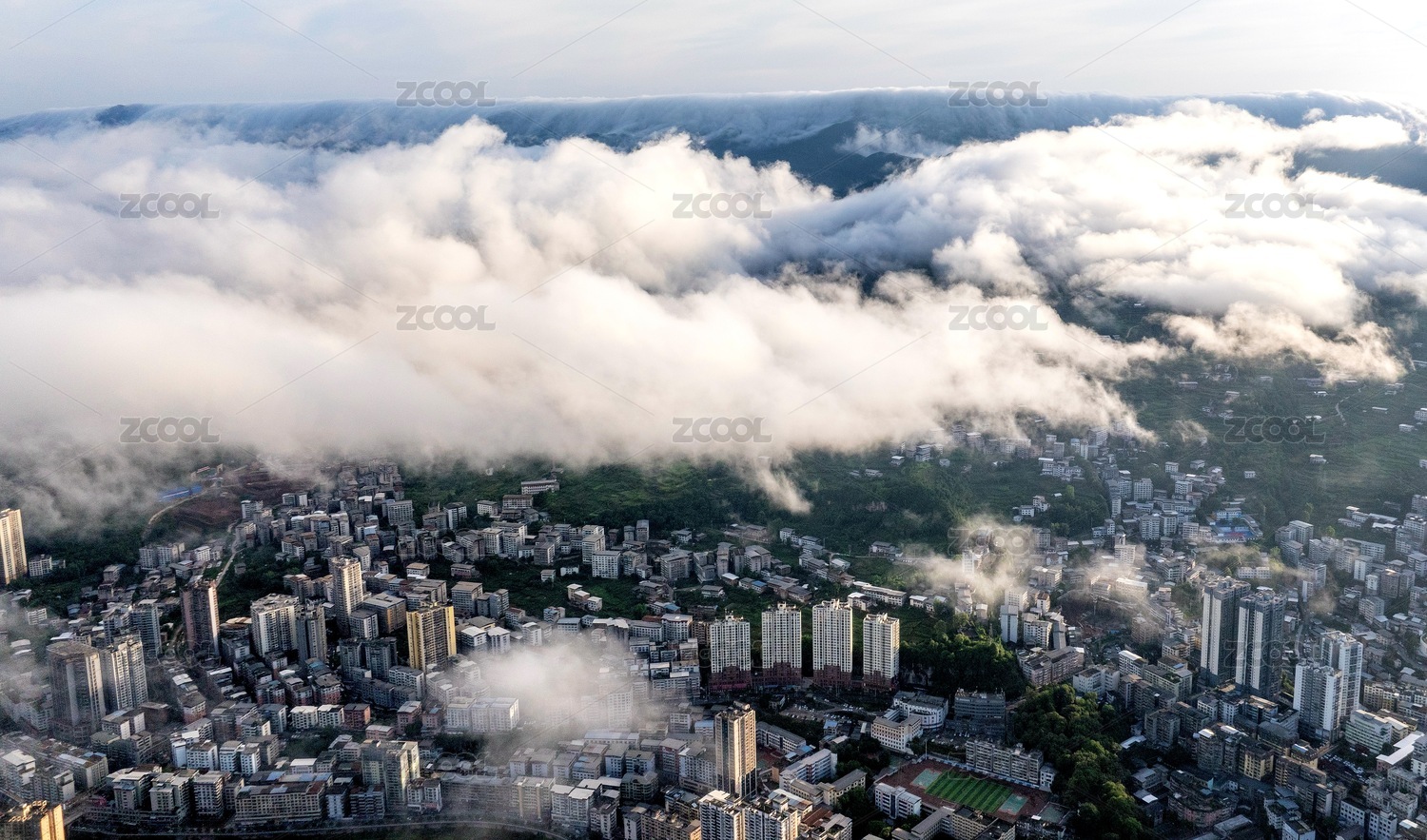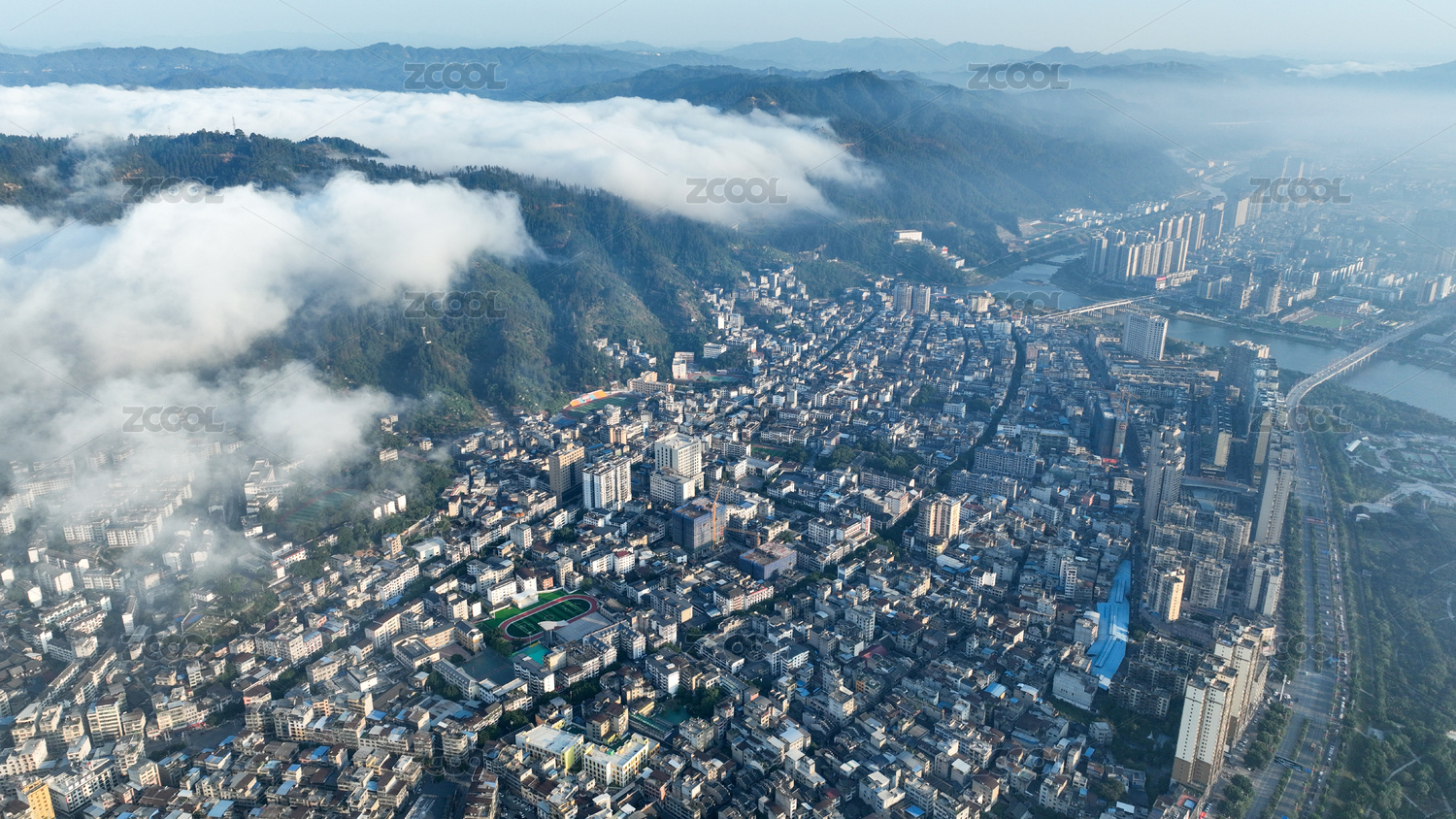 航拍日出时分云雾缭绕下的四川宜宾兴文县城