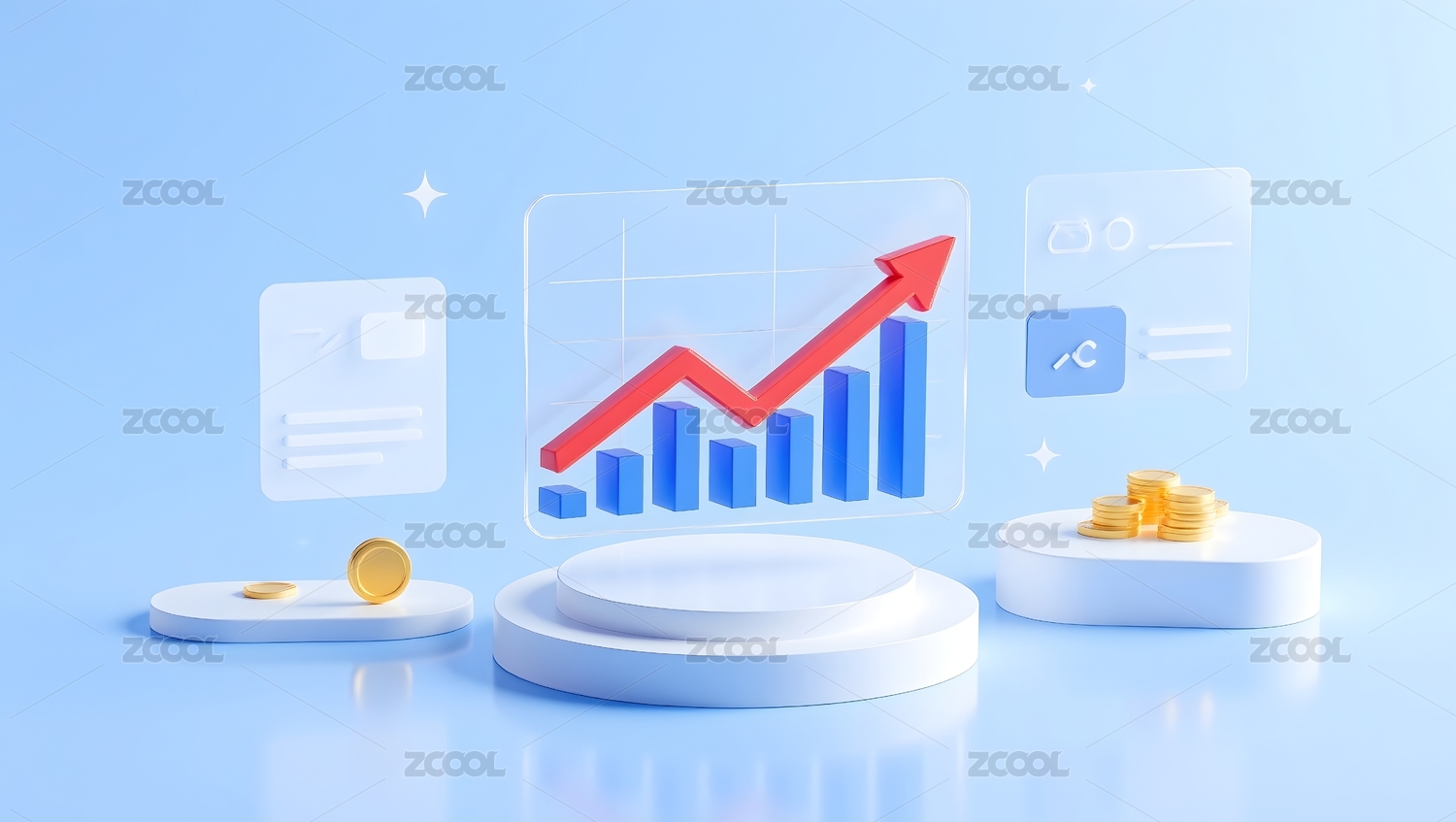 蓝色背景下的数据图表与金币