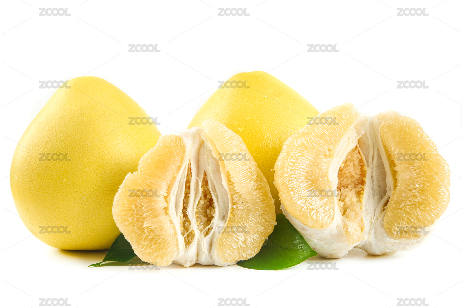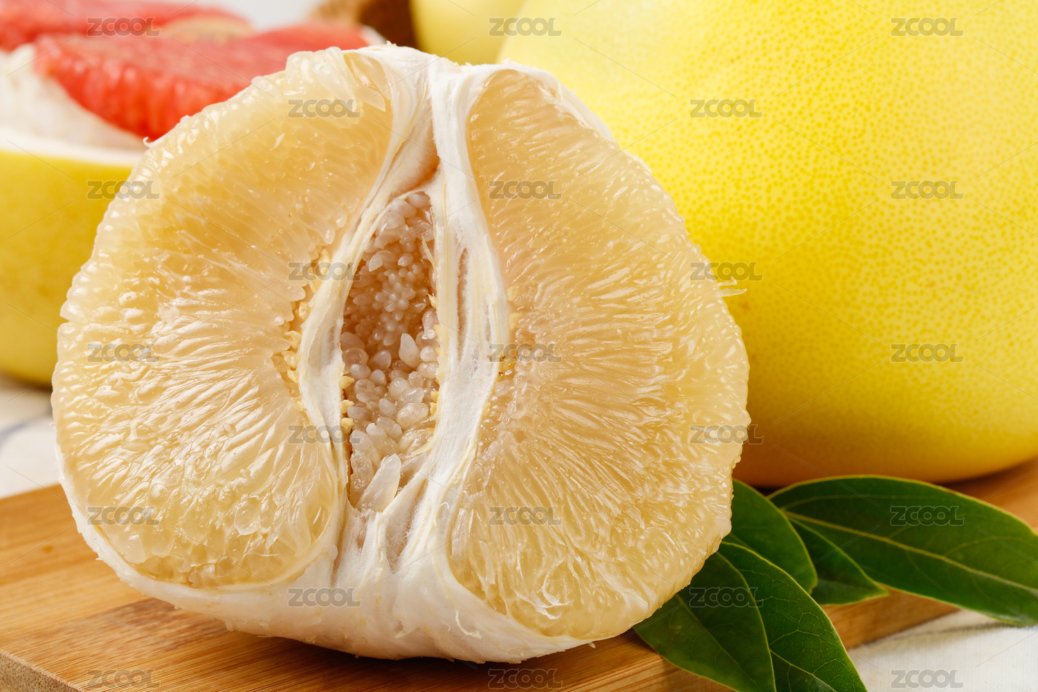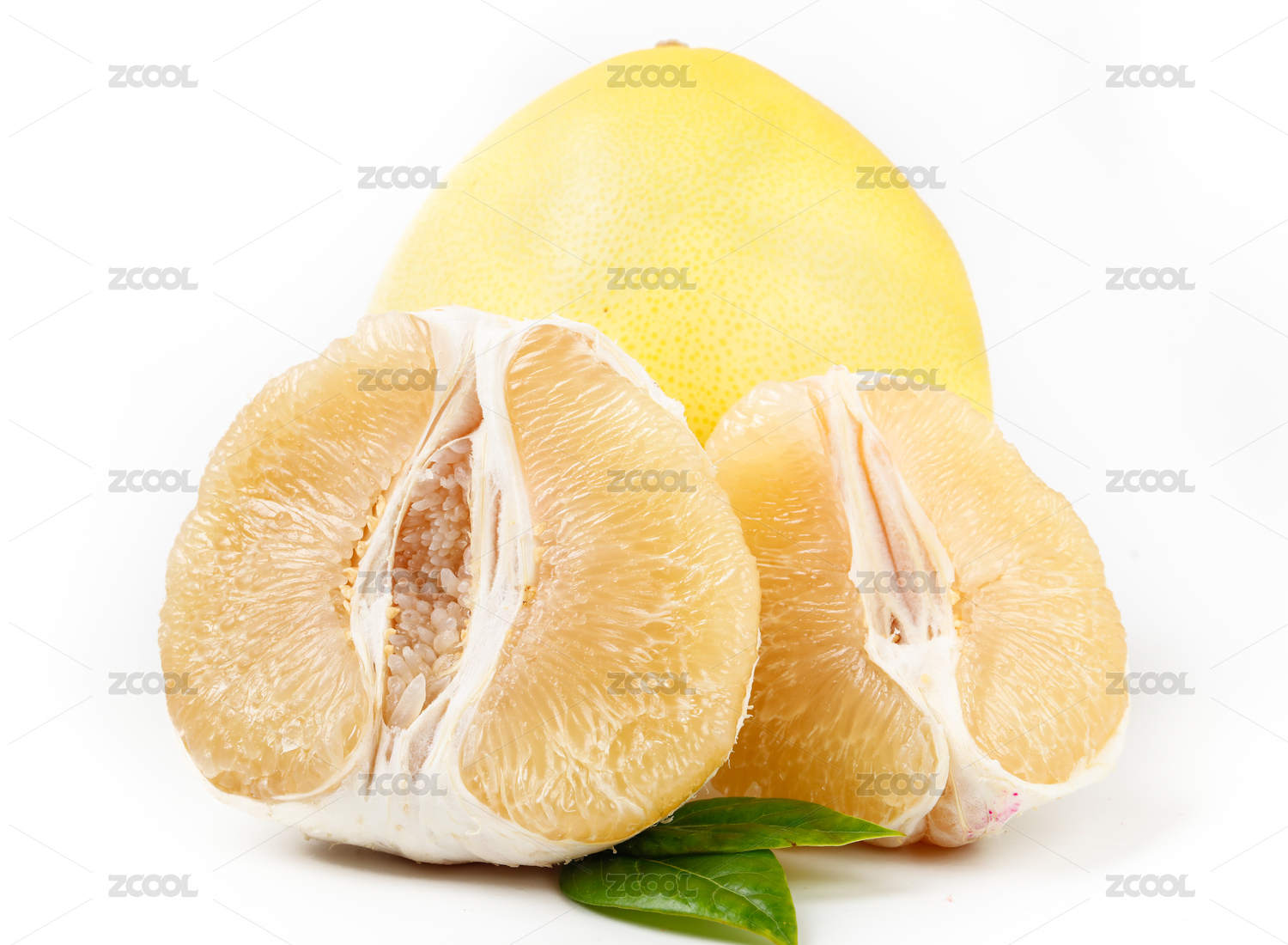 白底上放着一个蜜柚和去皮的沙田柚果肉
