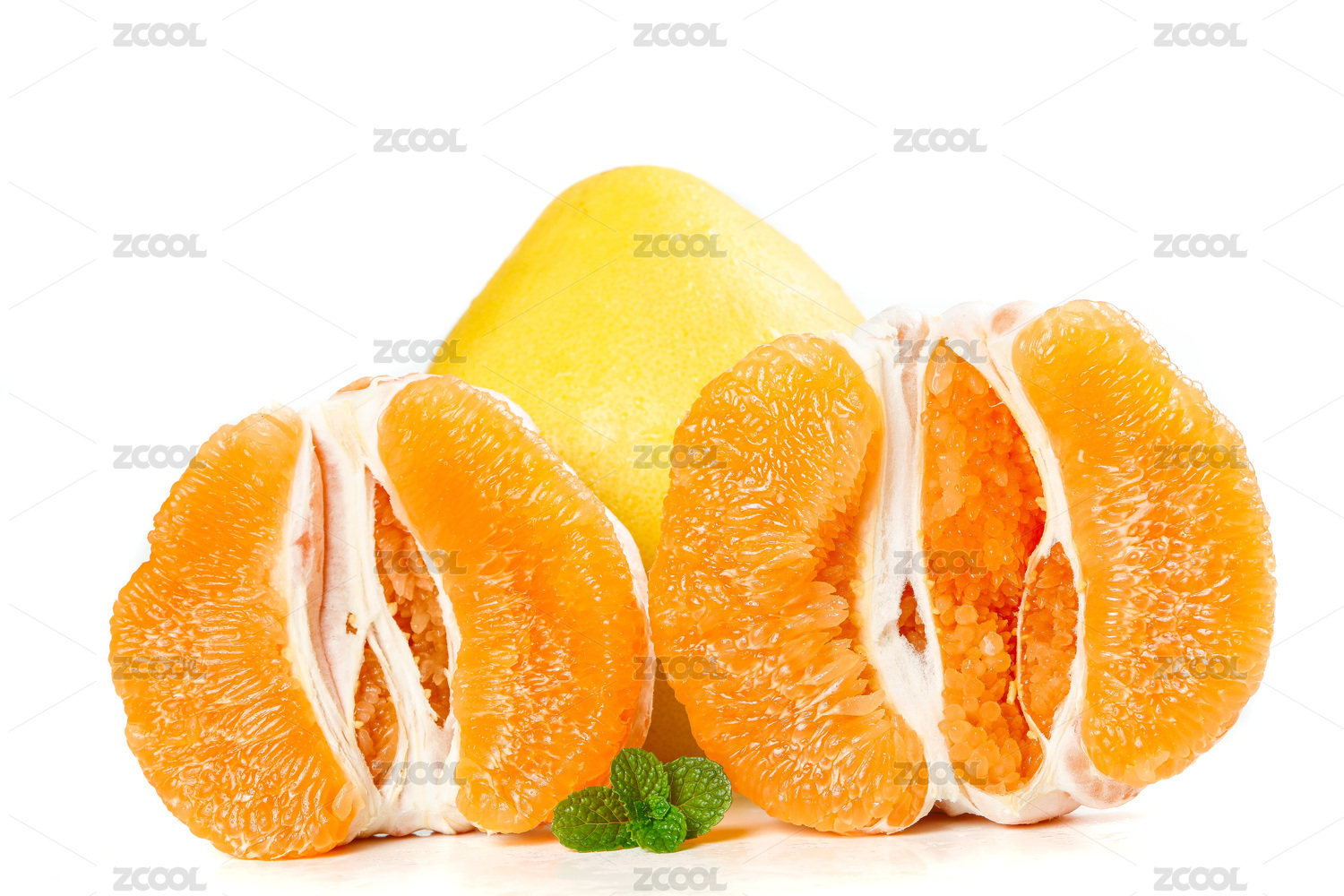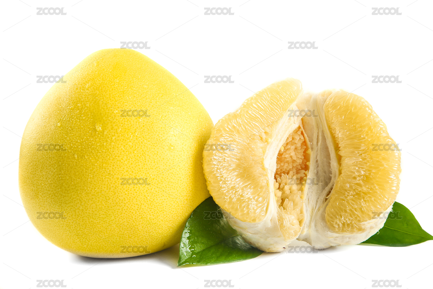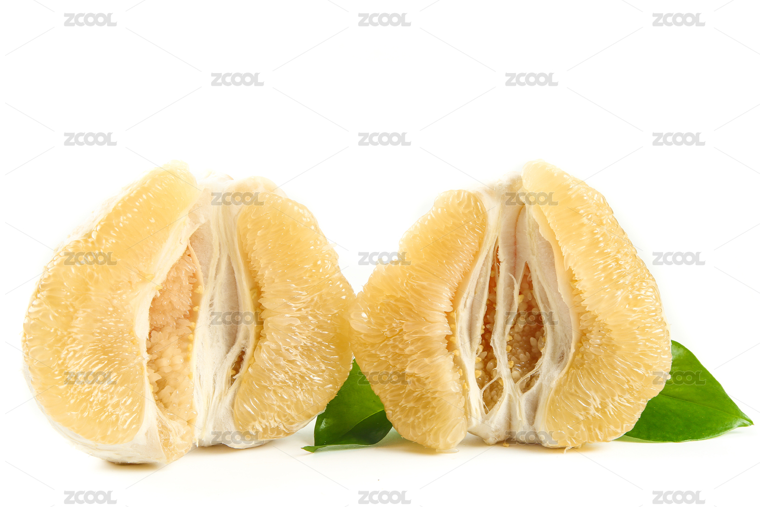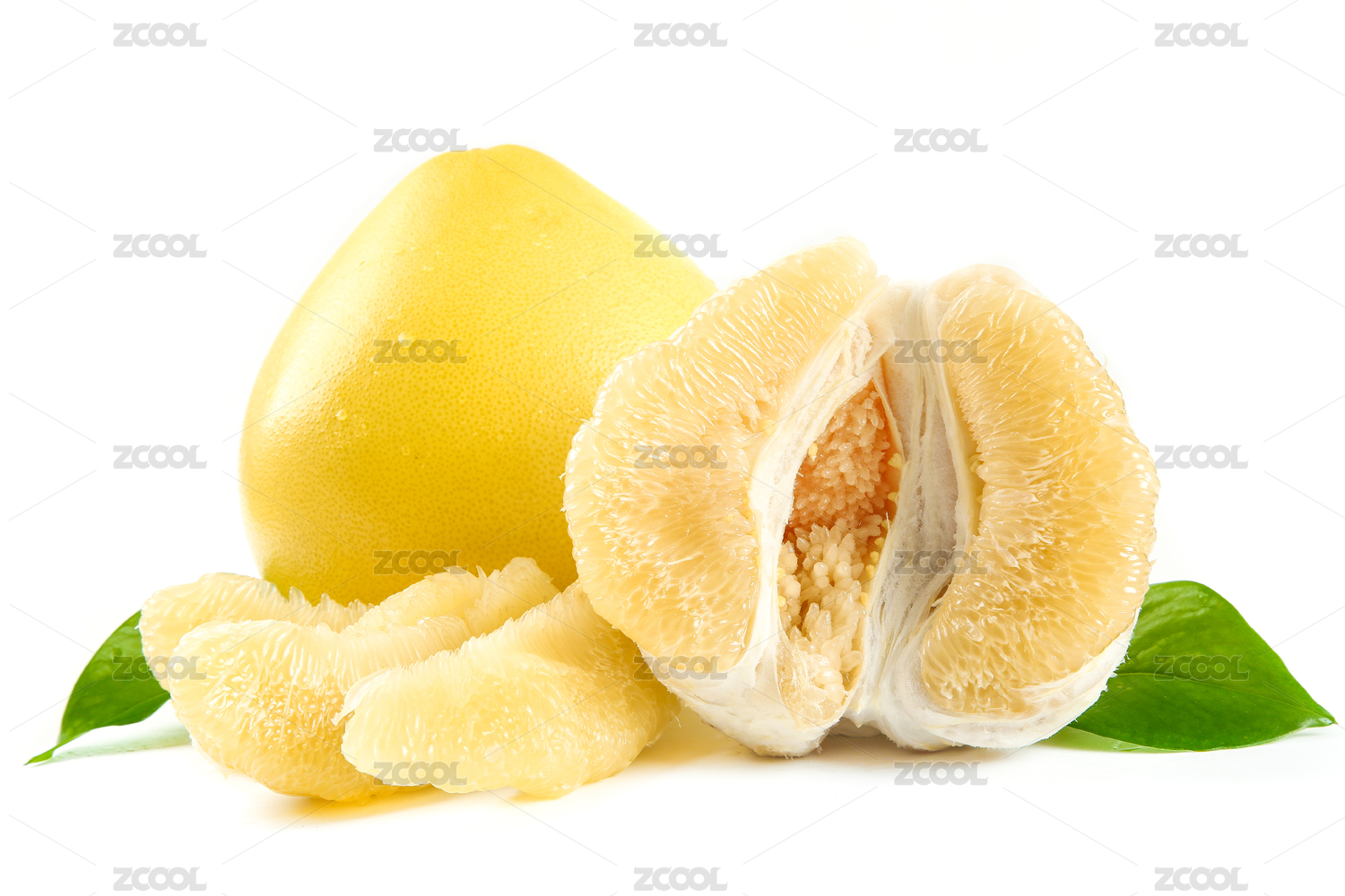 白底上放着一个蜜柚和去皮的沙田柚果肉