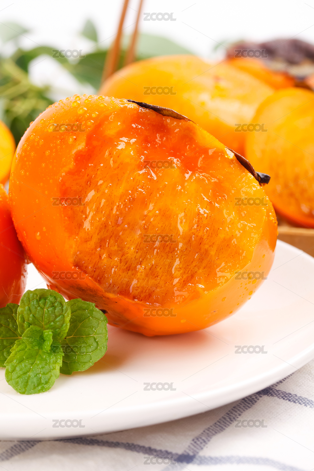 清新背景上放着一堆瑶乡脆柿和脆柿果肉