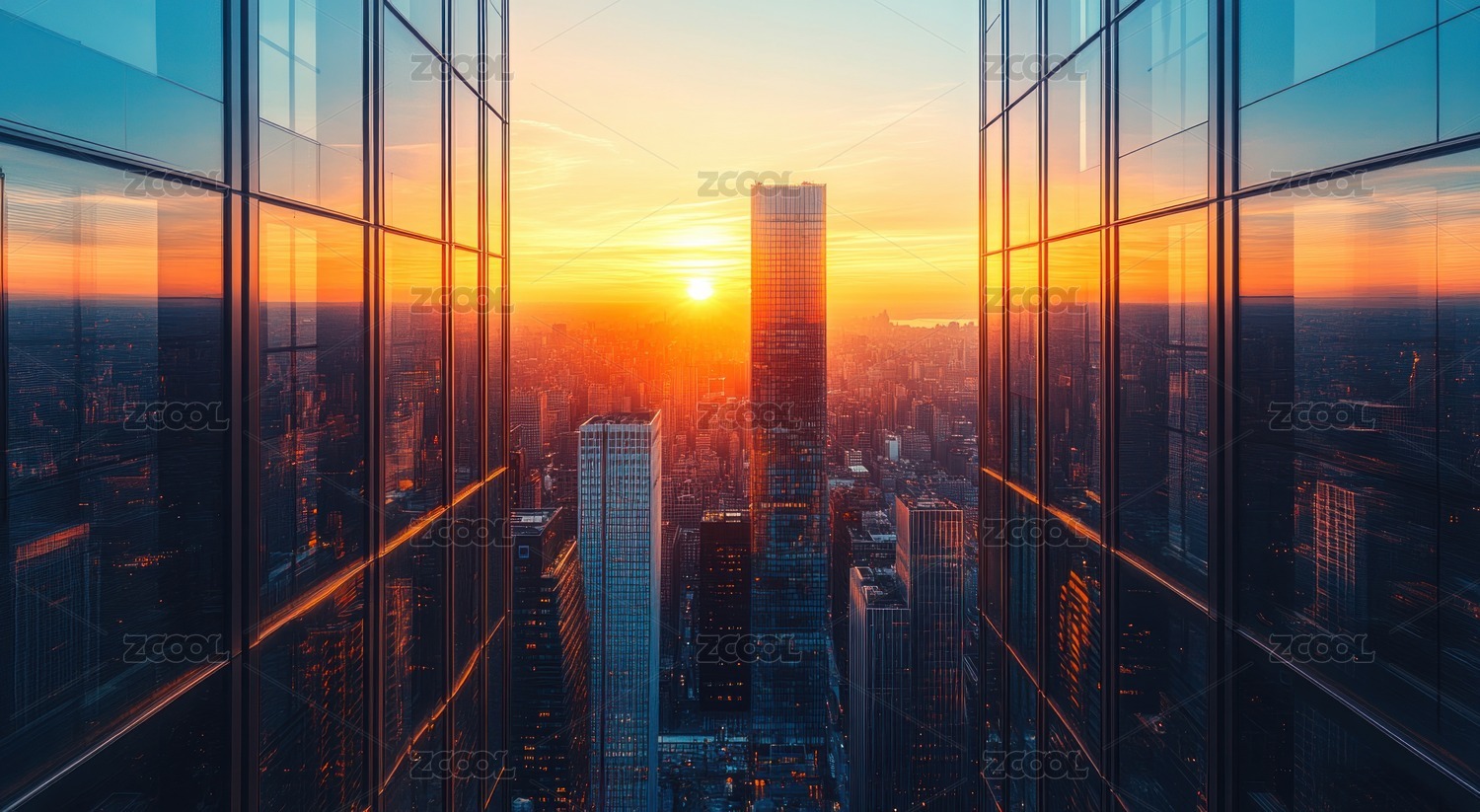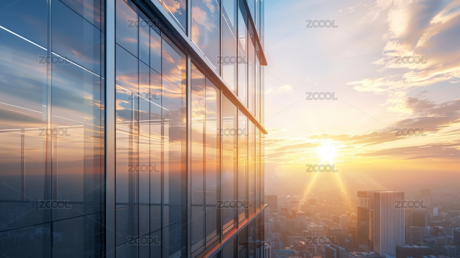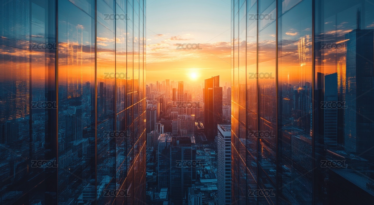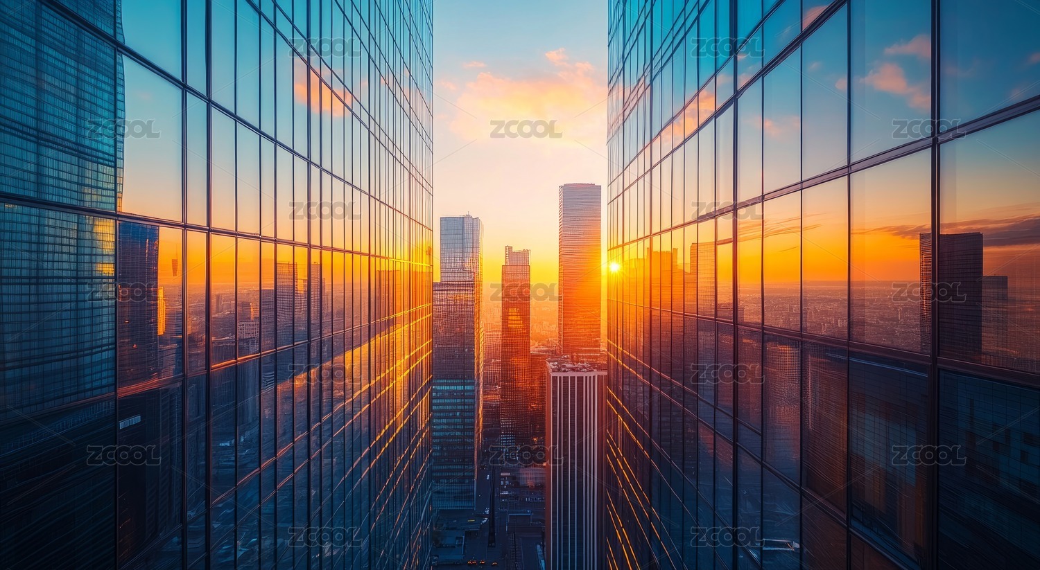 夕阳映照的城市摩天楼玻璃反射