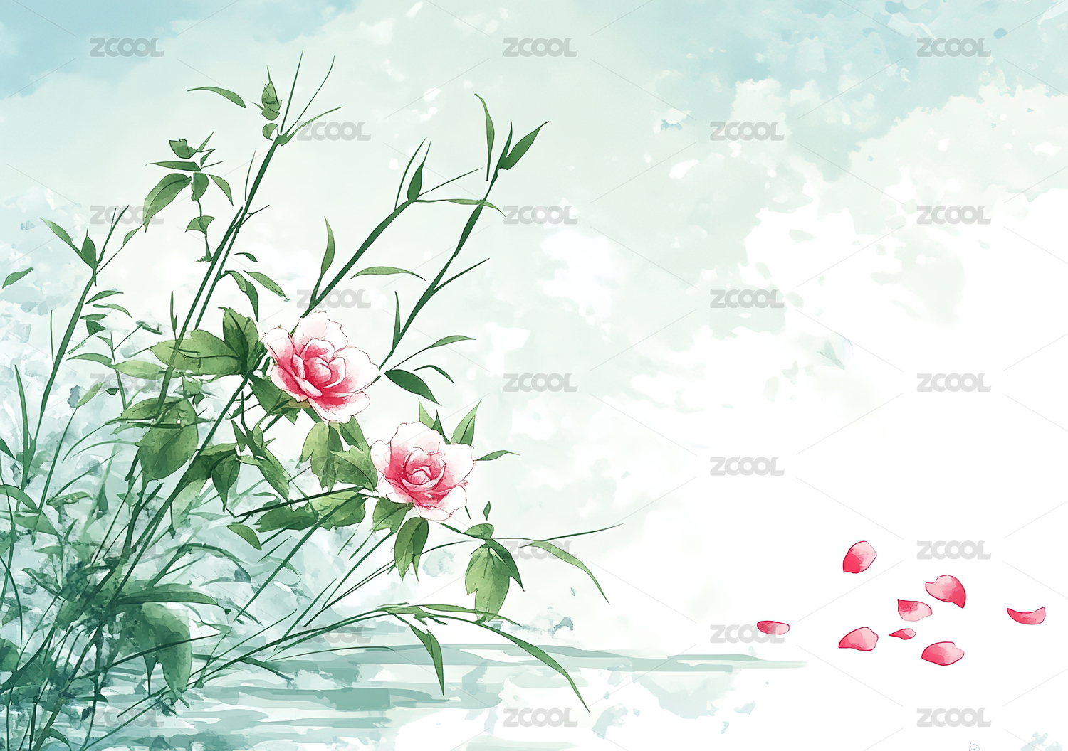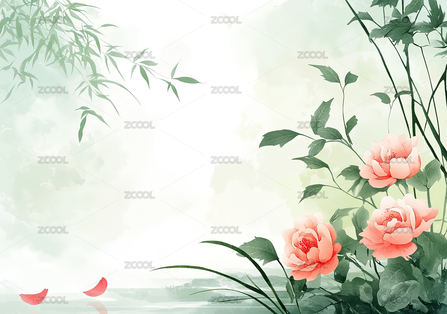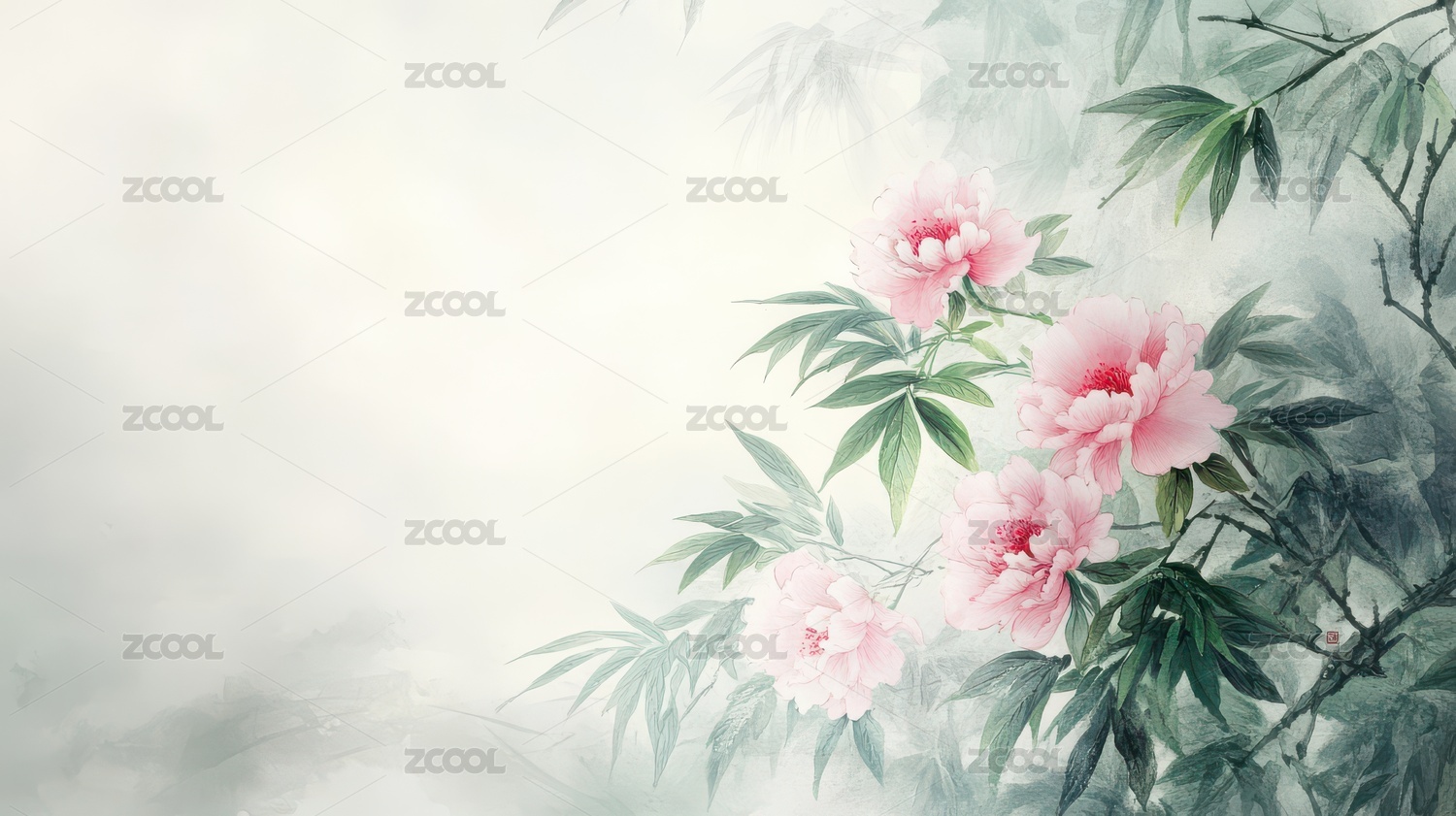 淡雅粉色牡丹与绿叶的水墨画卷