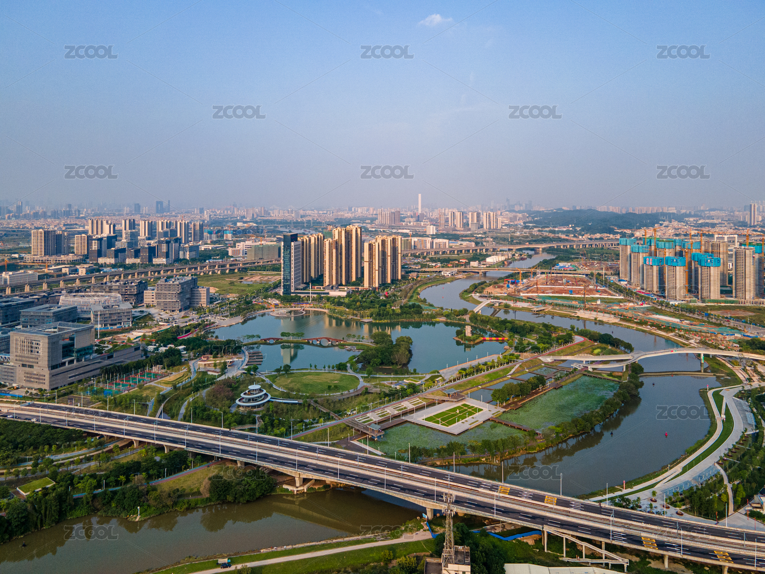 中国广东佛山南海三山新城文翰湖公园景观航拍
