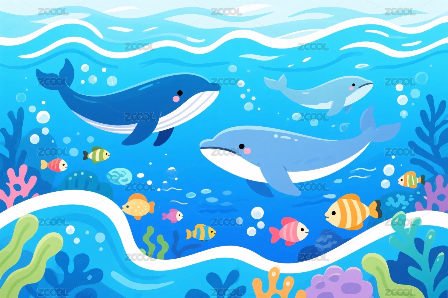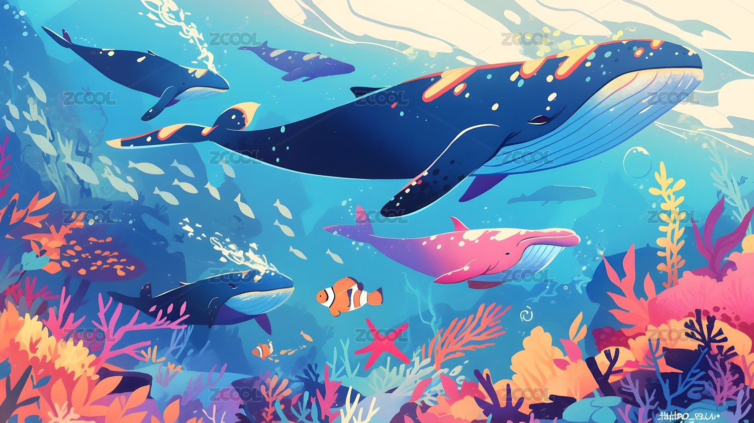 蓝色海洋中小姑娘与鲸鱼共舞海草鱼群环绕