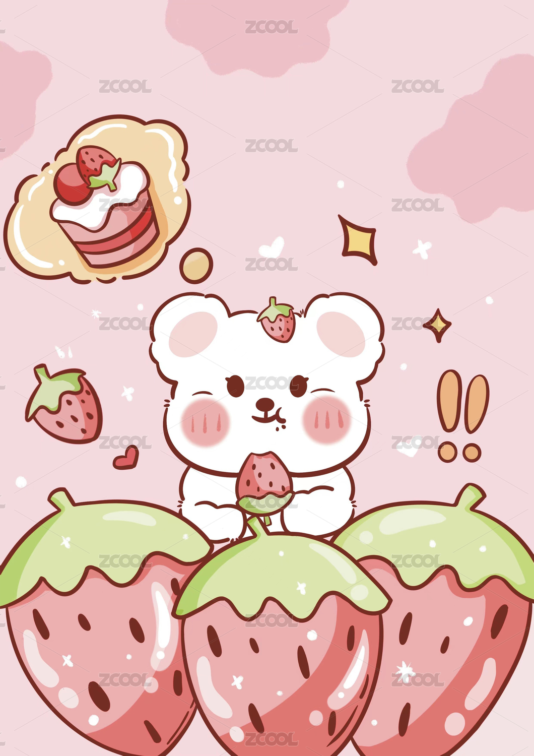 手绘插画平铺背景可爱卡通小熊橙子草莓冰棍