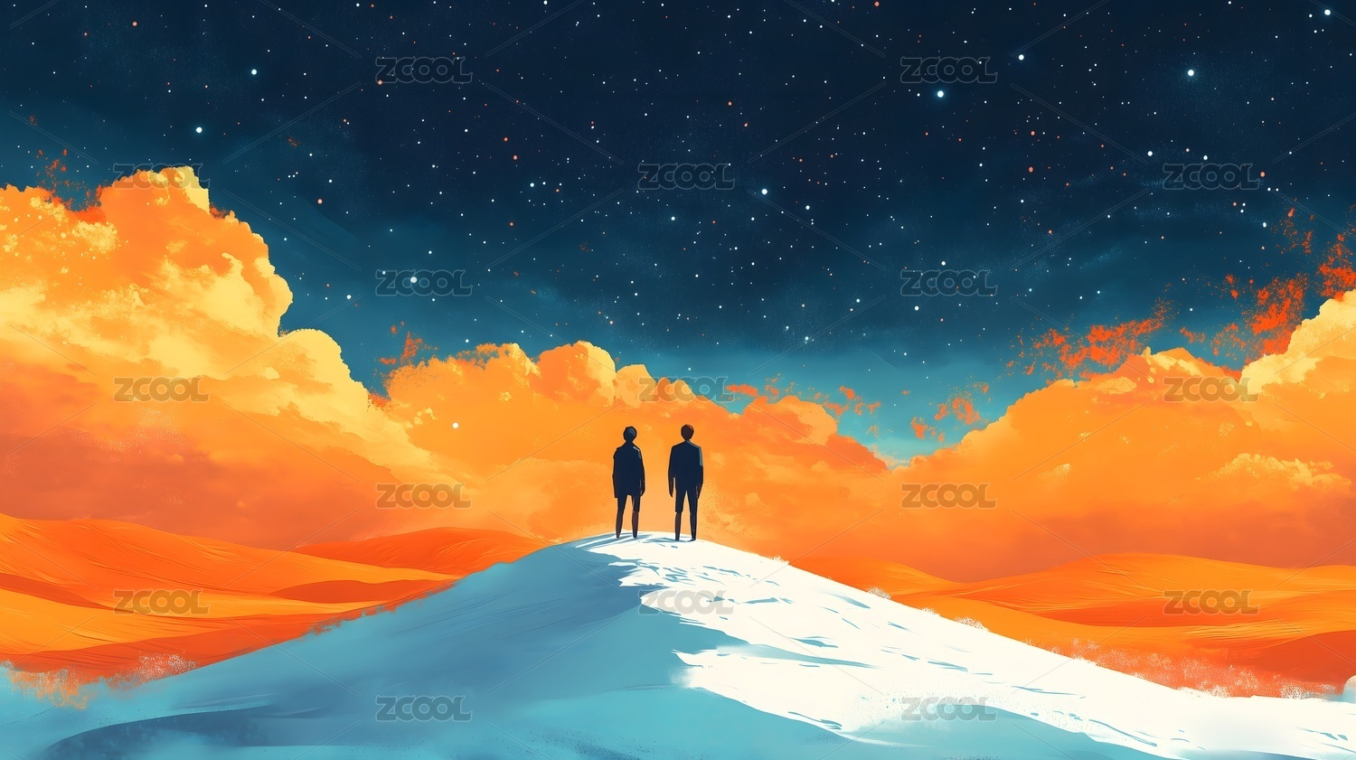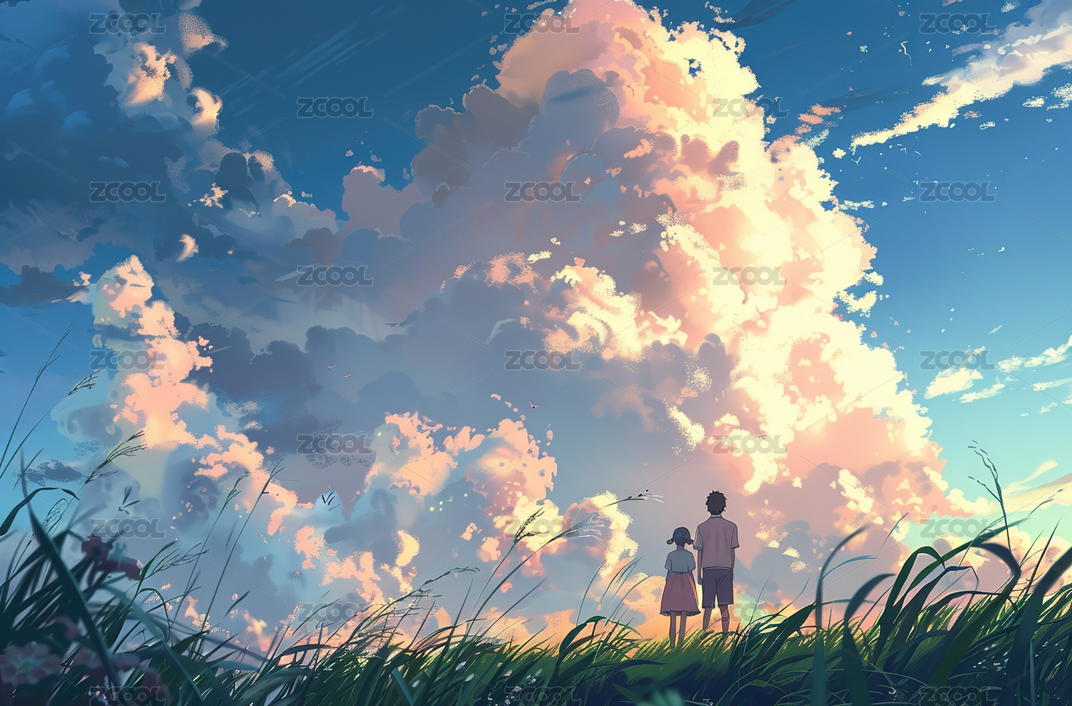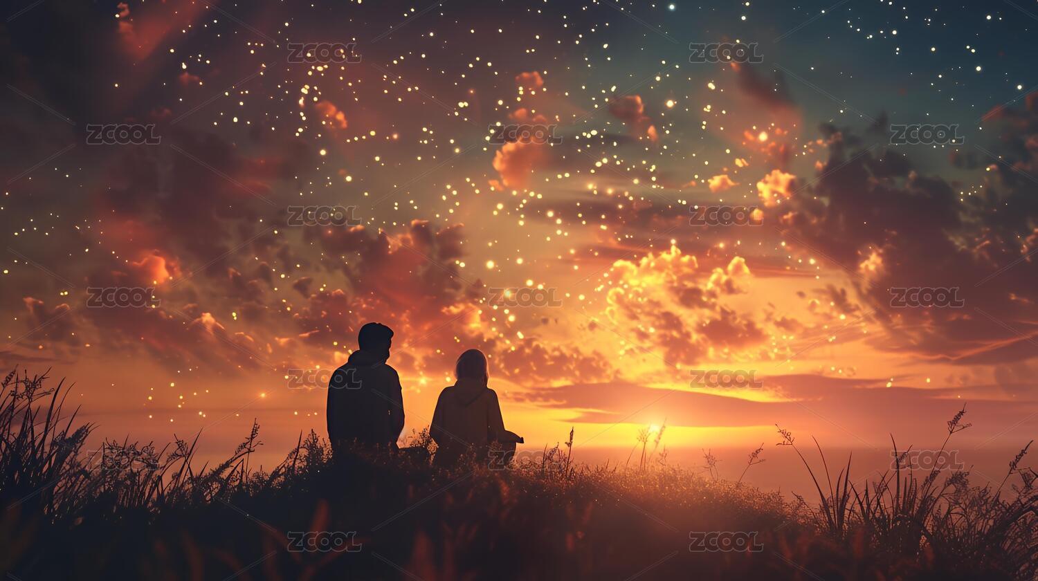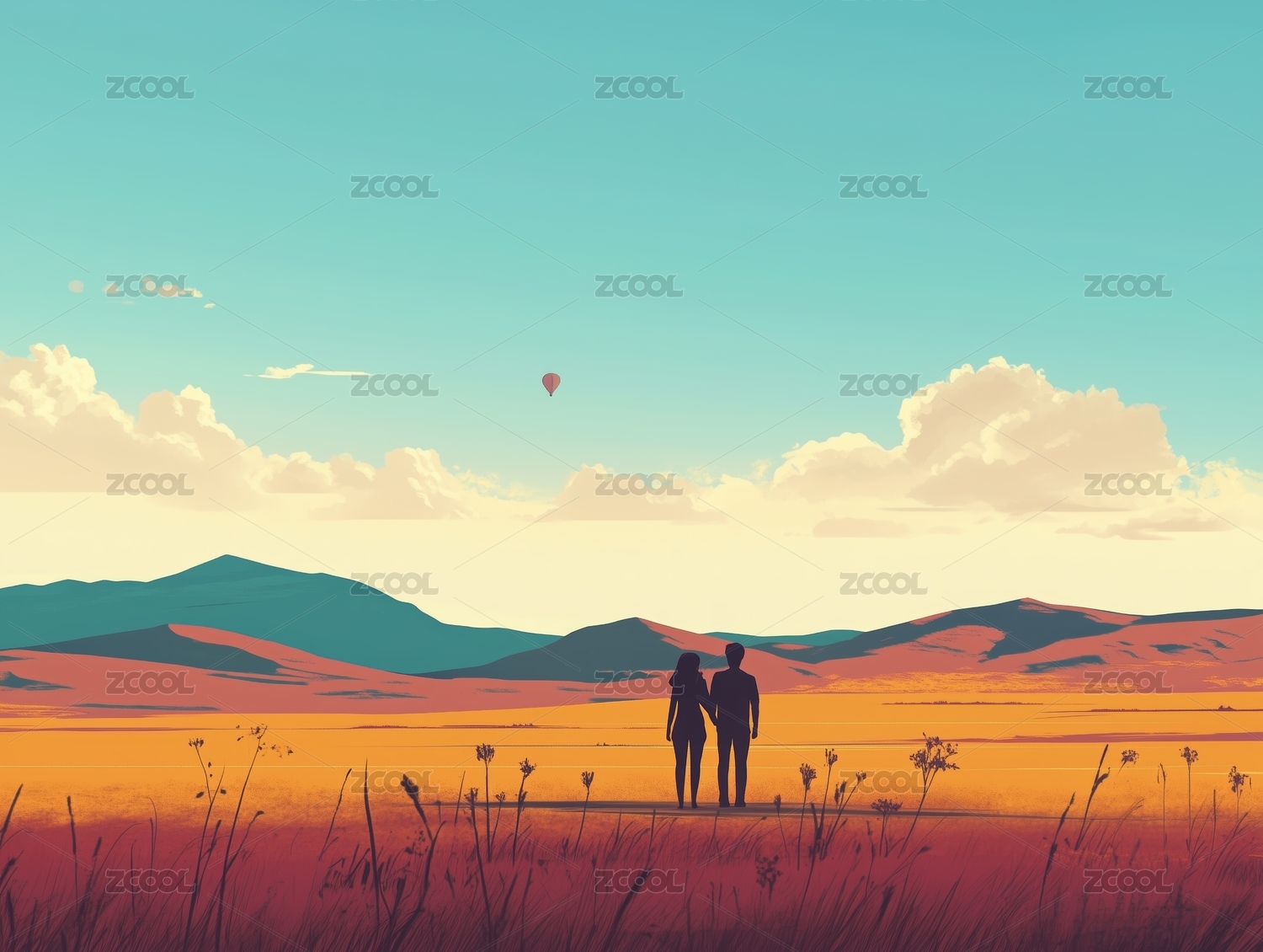 草原上情侣仰望飞鸟与粉云的宁静时刻