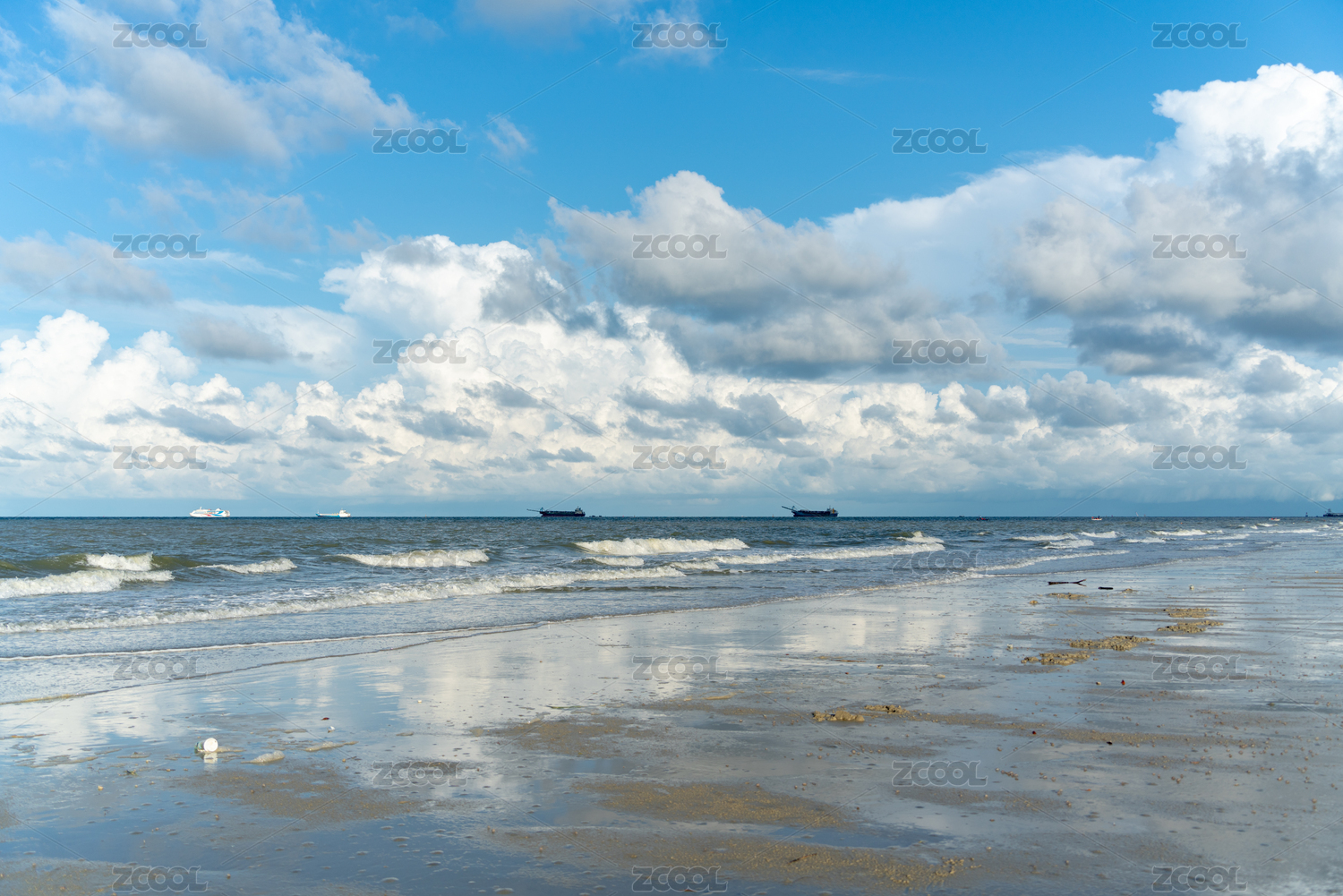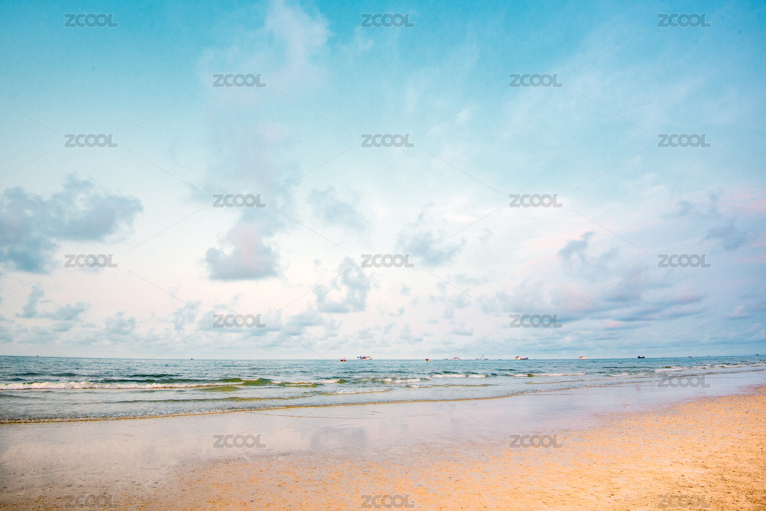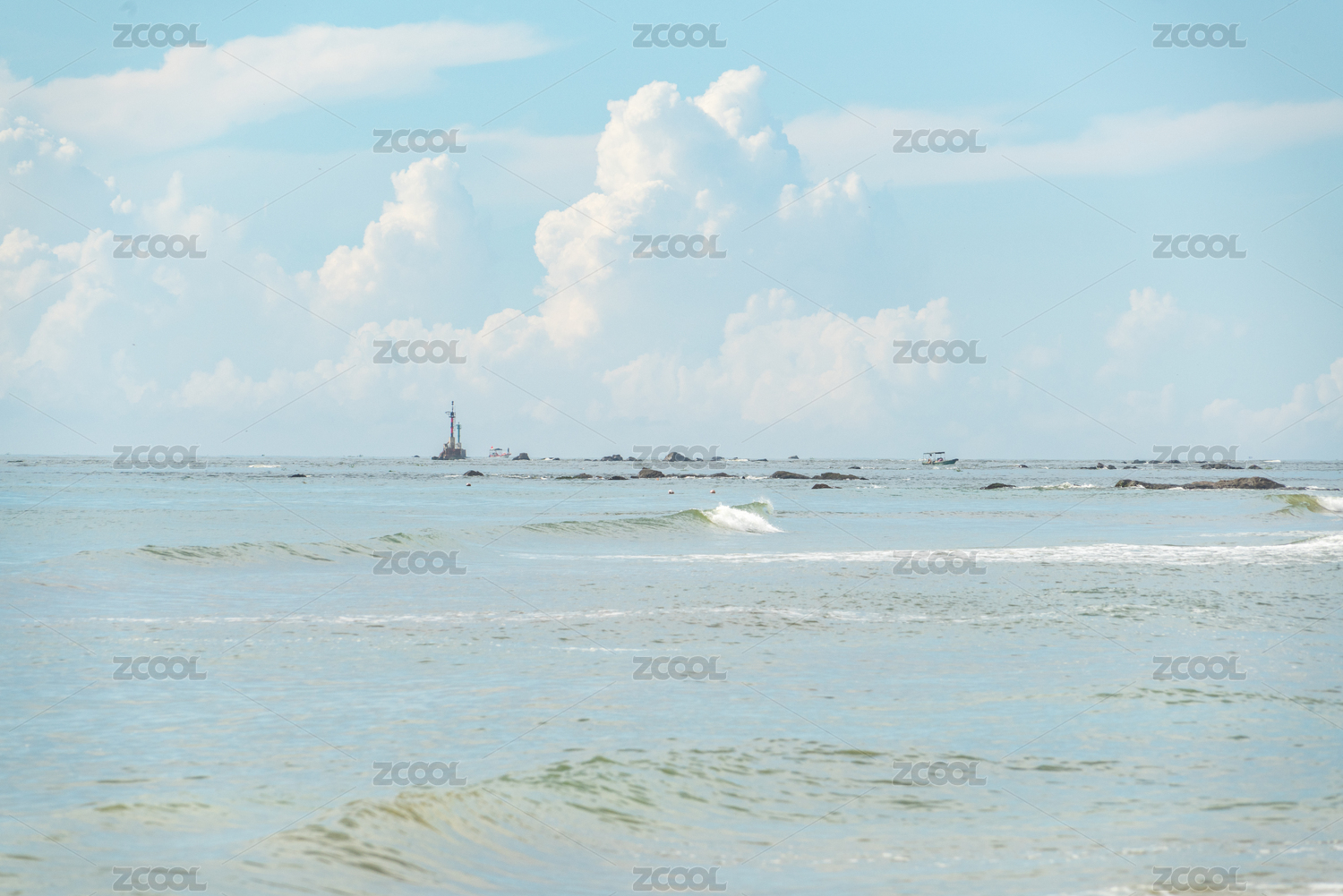 海南博鳌海岸边蓝天白云下的碧波沙滩远景