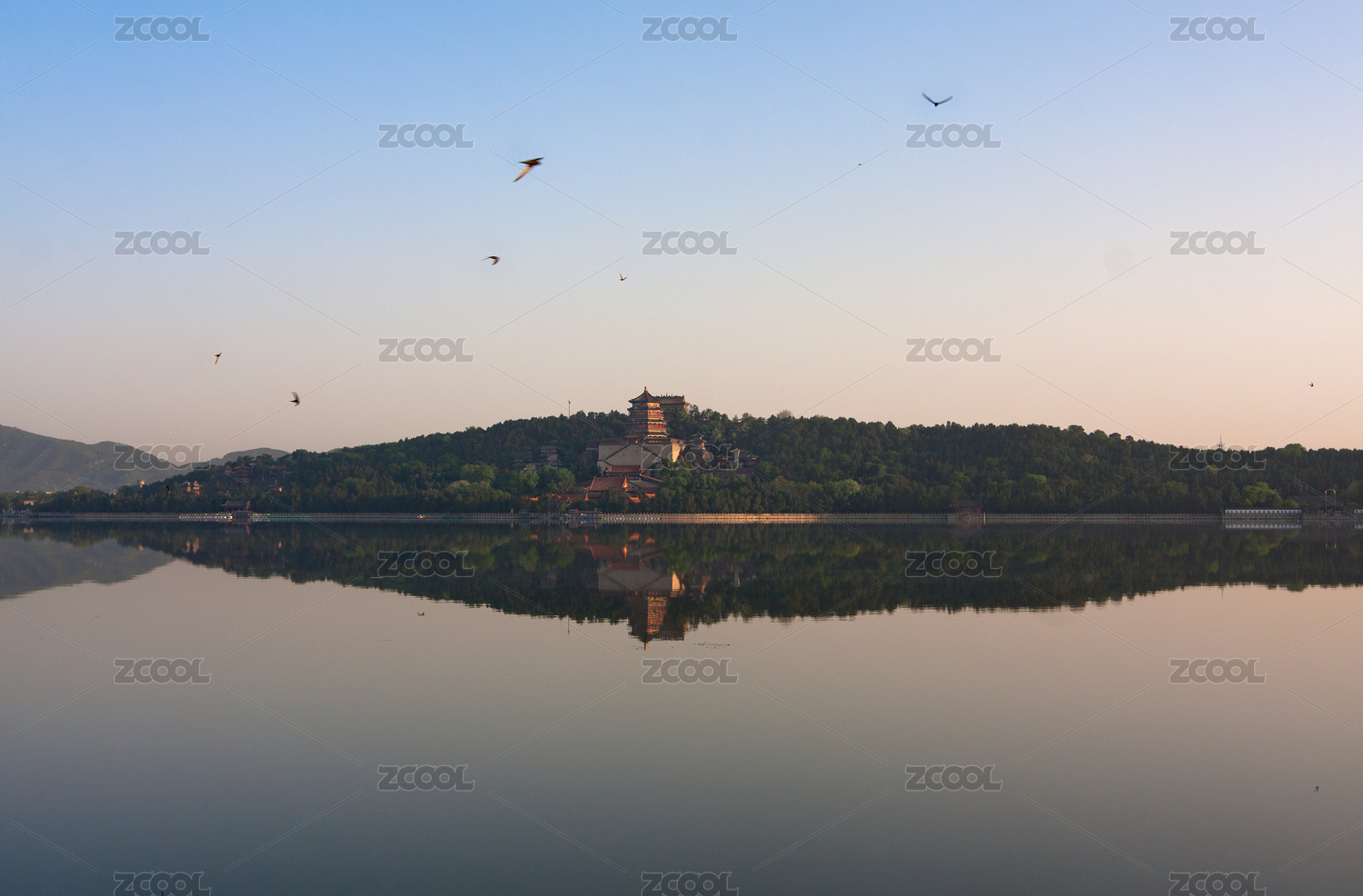 清晨,天空,蓝色,颐和园,昆明湖,湖水,水面,水墨,反射,倒影