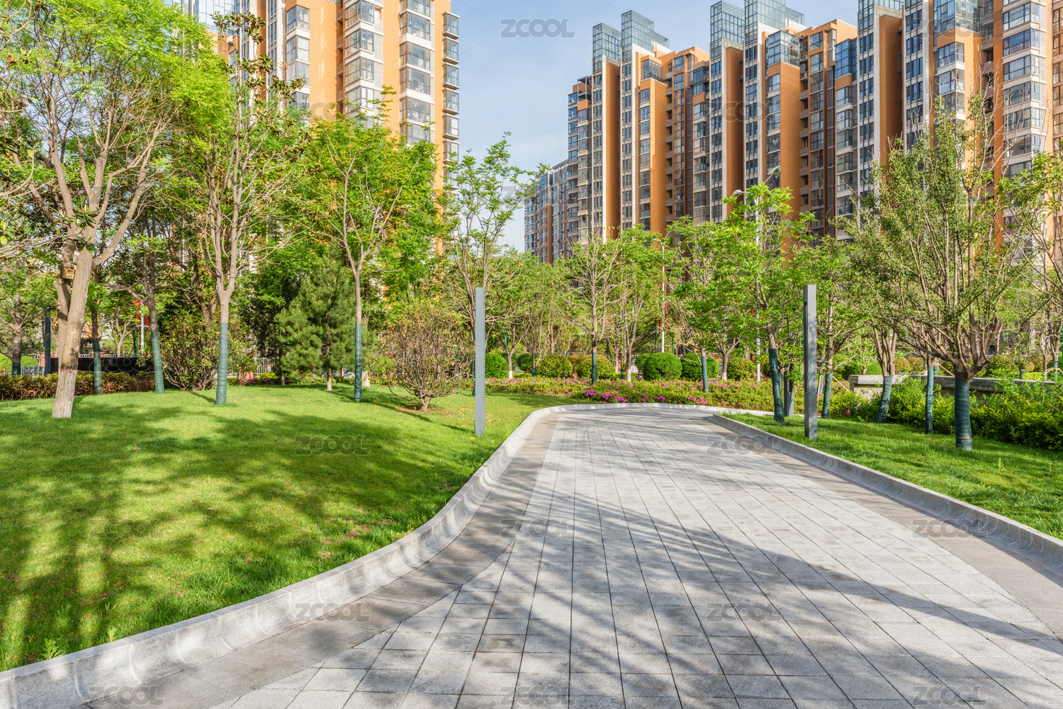 小区住宅里弯曲的步行道,砖路边绿色草坪,园林景观设计