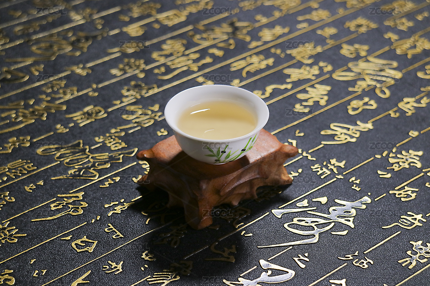 盖碗茶三才杯摆放在窗棂影木桌面上