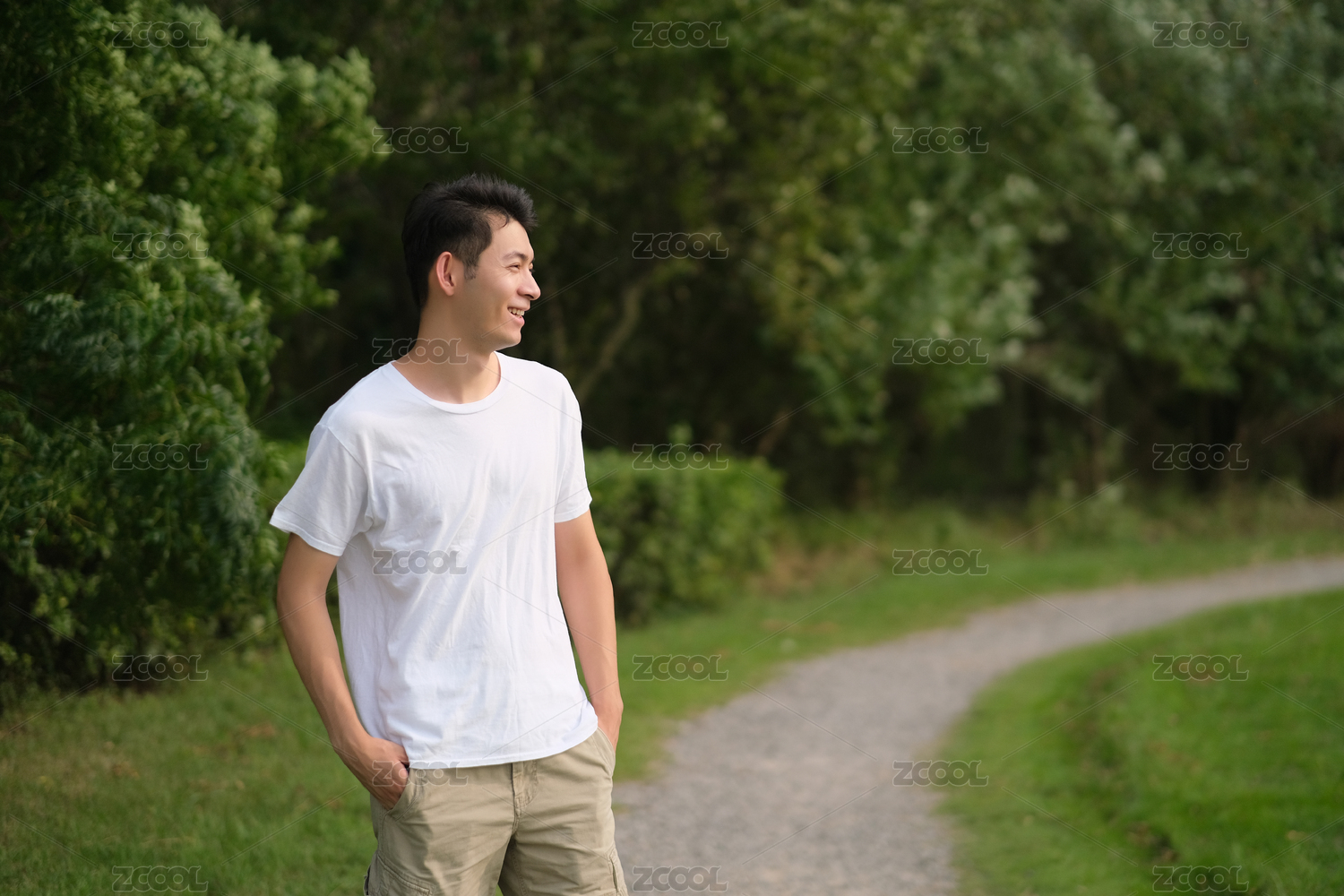 年轻中国帅哥在夏天绿色的森林公园快乐的笑