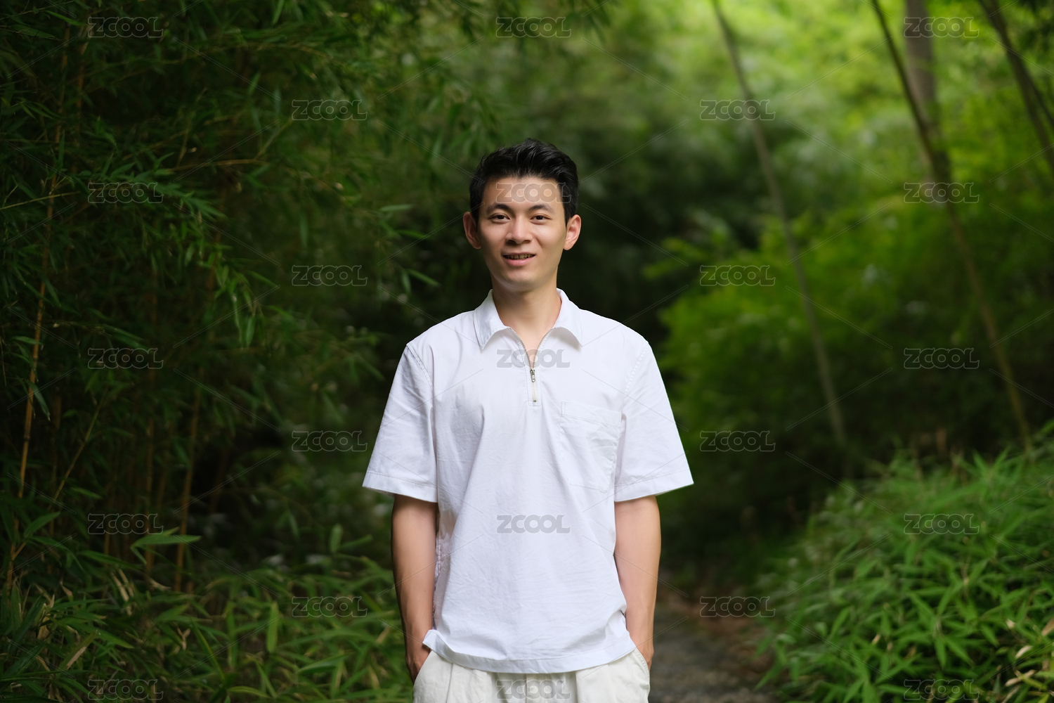年轻英俊的中国帅哥在竹林开心快乐的侧脸笑