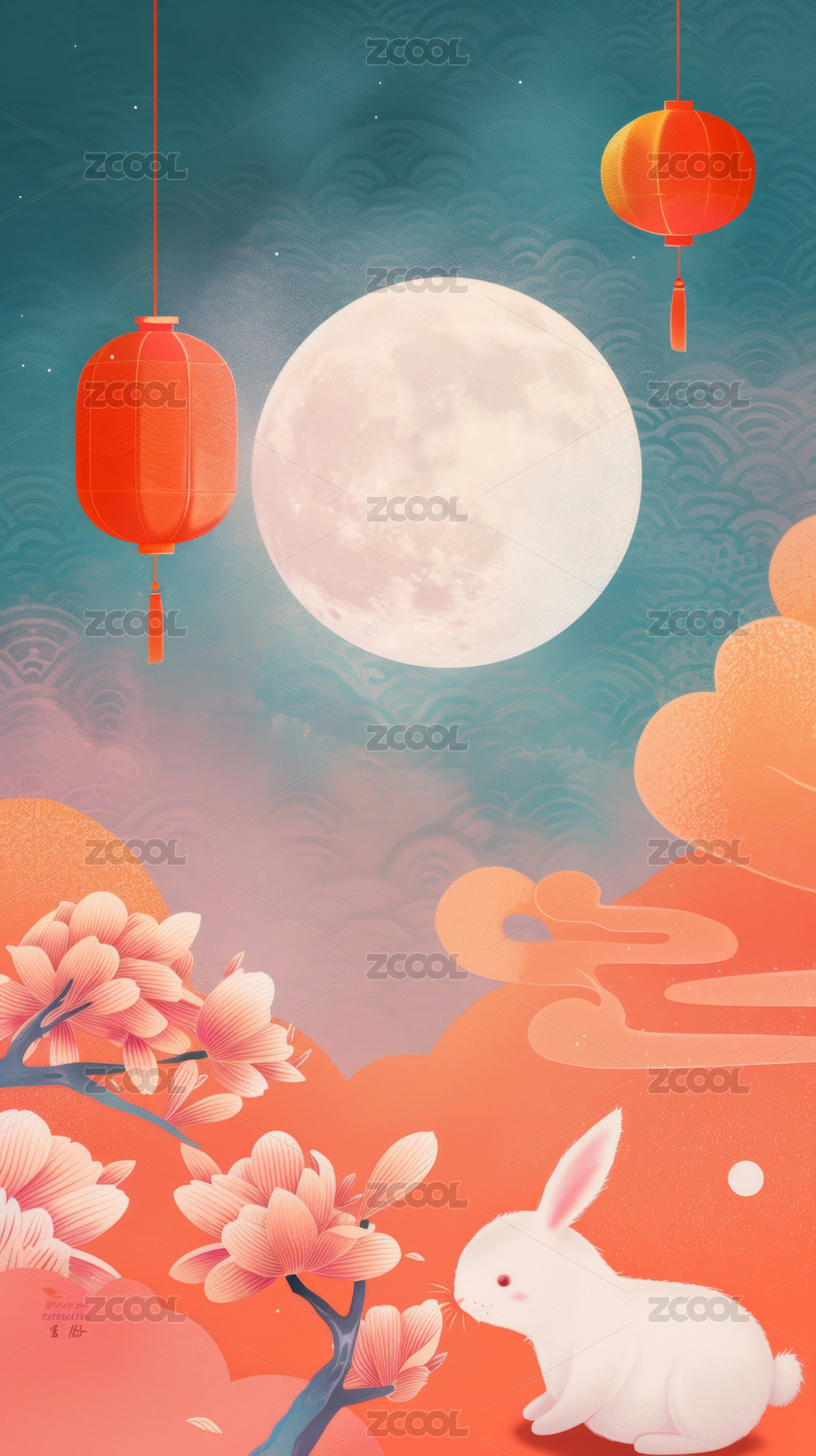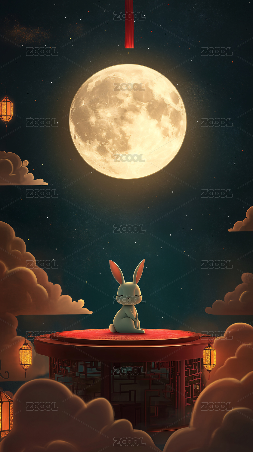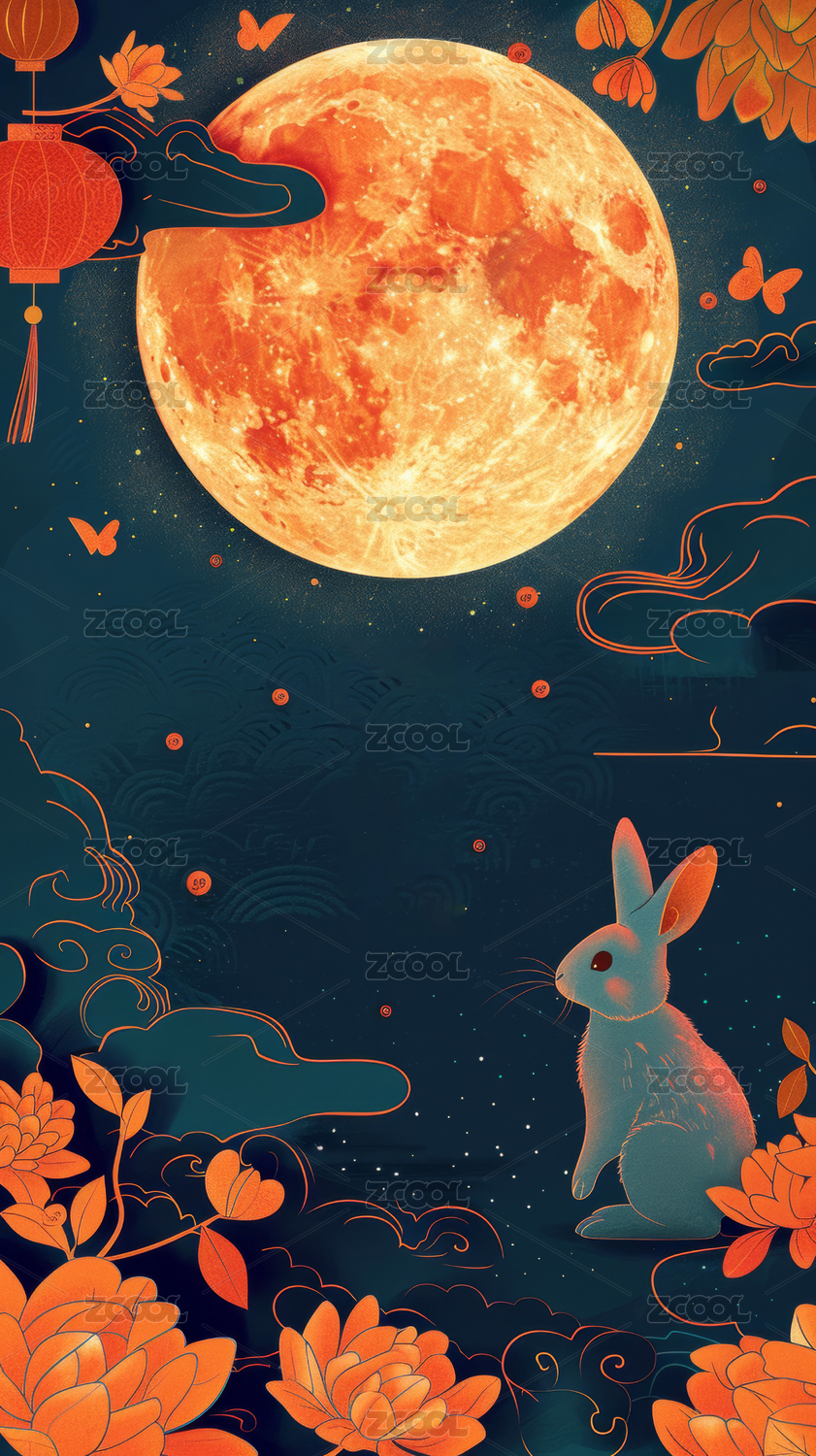 中秋节金兔跳跃满月国潮风金边贺图创意插画