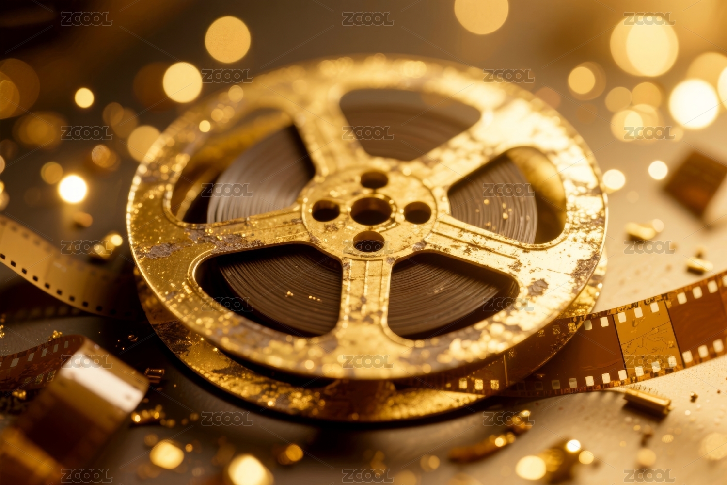 金色背景上的电影胶片和金色光点