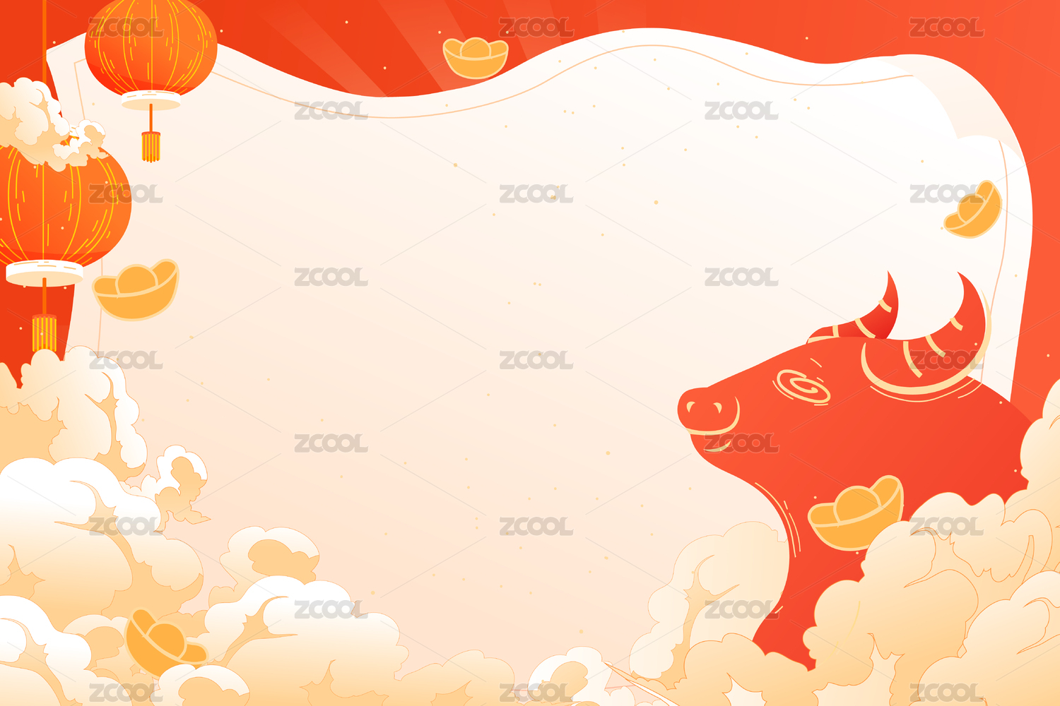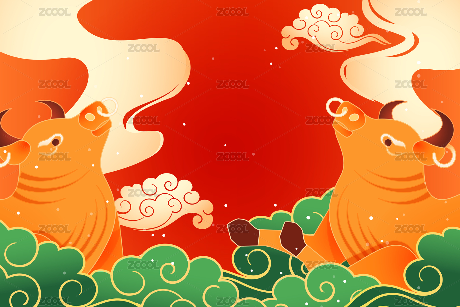 国潮风,新中式,牛年吉祥,牛年背景,牛转钱坤,牛转乾坤,牛年插画,祥云,仙鹤,牛