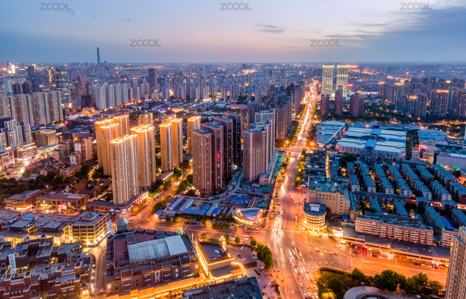 亚洲中国四川成都市中心建筑亮灯日落全景