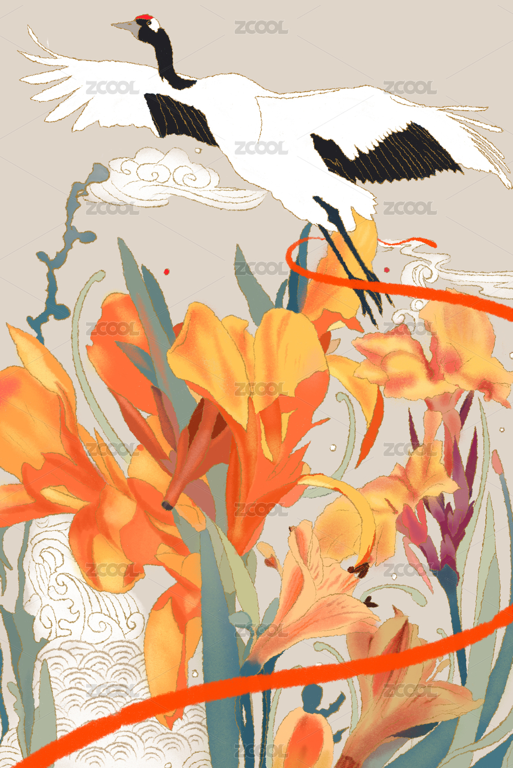 开心浪漫的情人骑大鹅在荷塘中放松插画