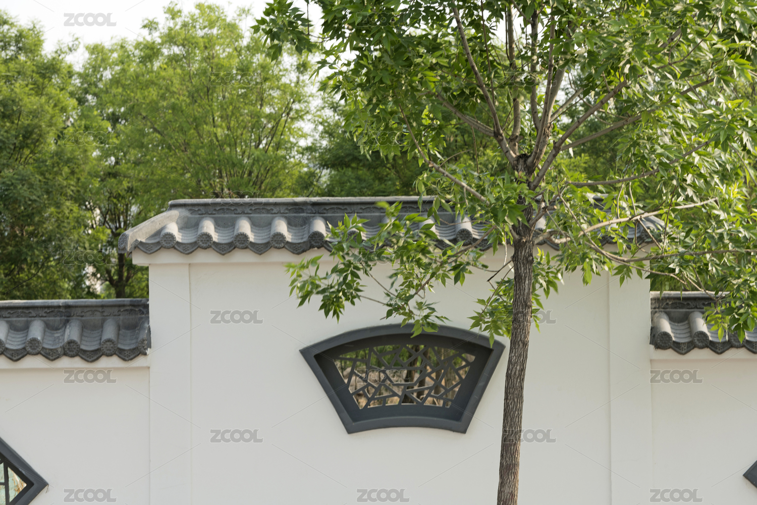 绿树下徽派建筑风格的公园围墙