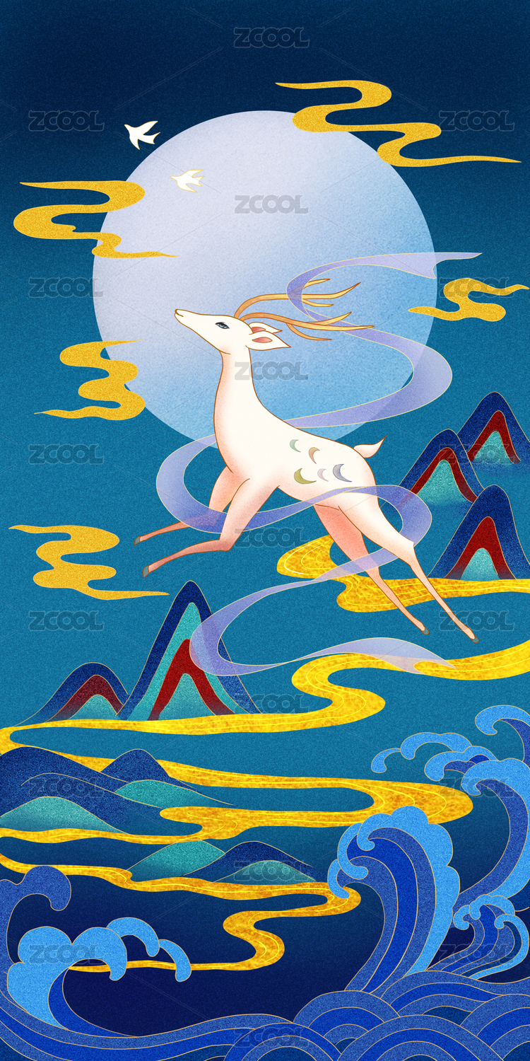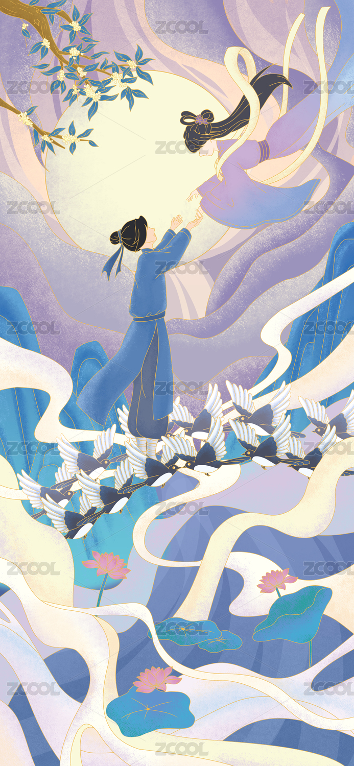中秋节嫦娥奔月黄蓝唯美渐变古风插画