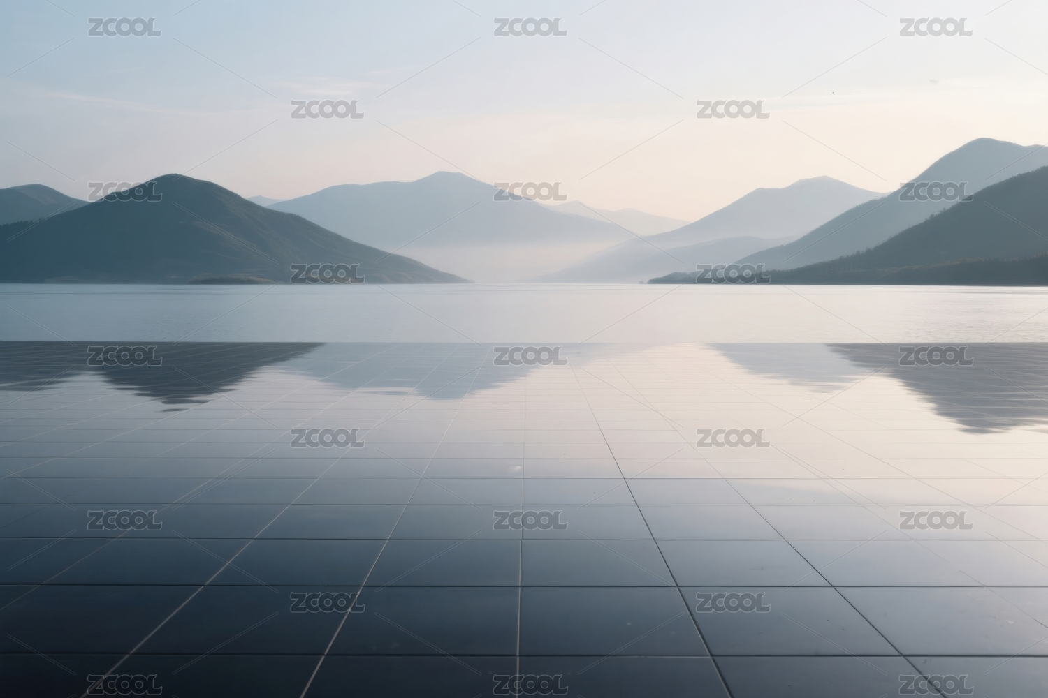 山水风景日落天空与木质平台地面背景