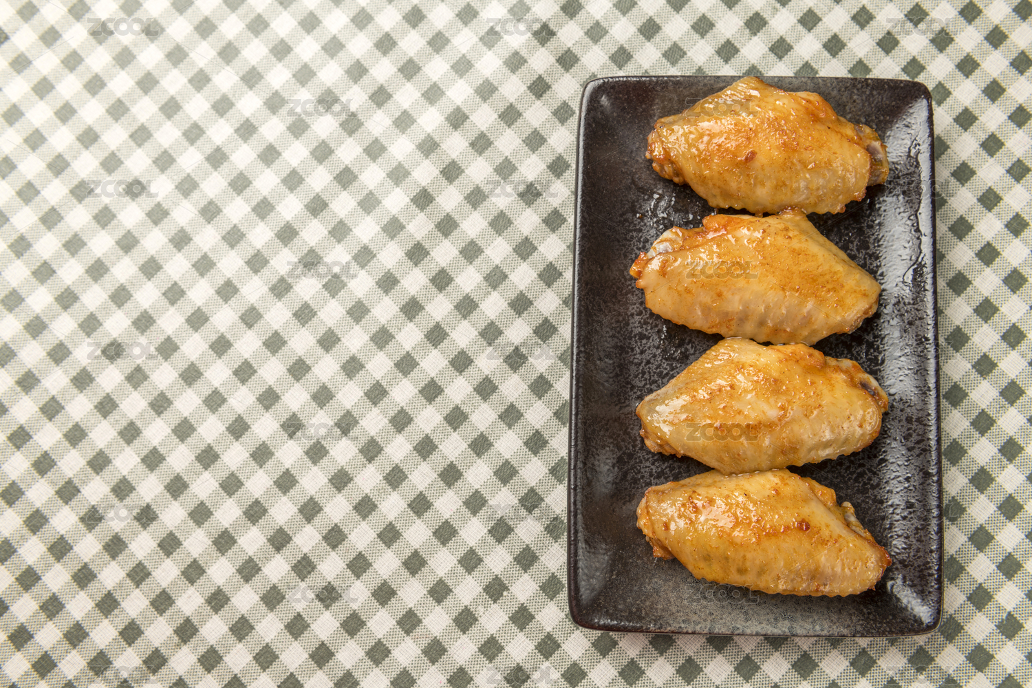 一盘烤鸡翅烤鸡翅中摆放在格子桌布上特写